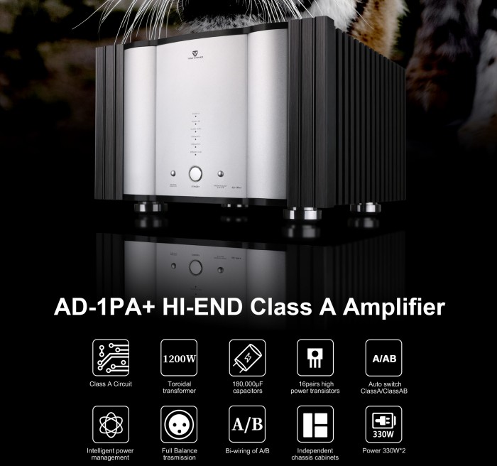 AD-1PA+ is a Hi-Fi stereo amplifier with Class A/AB mode, high power transformer, transistors and capacitors. It was designed by Tonewinner which is chinese high end audio factory with over 30-year professional experience.