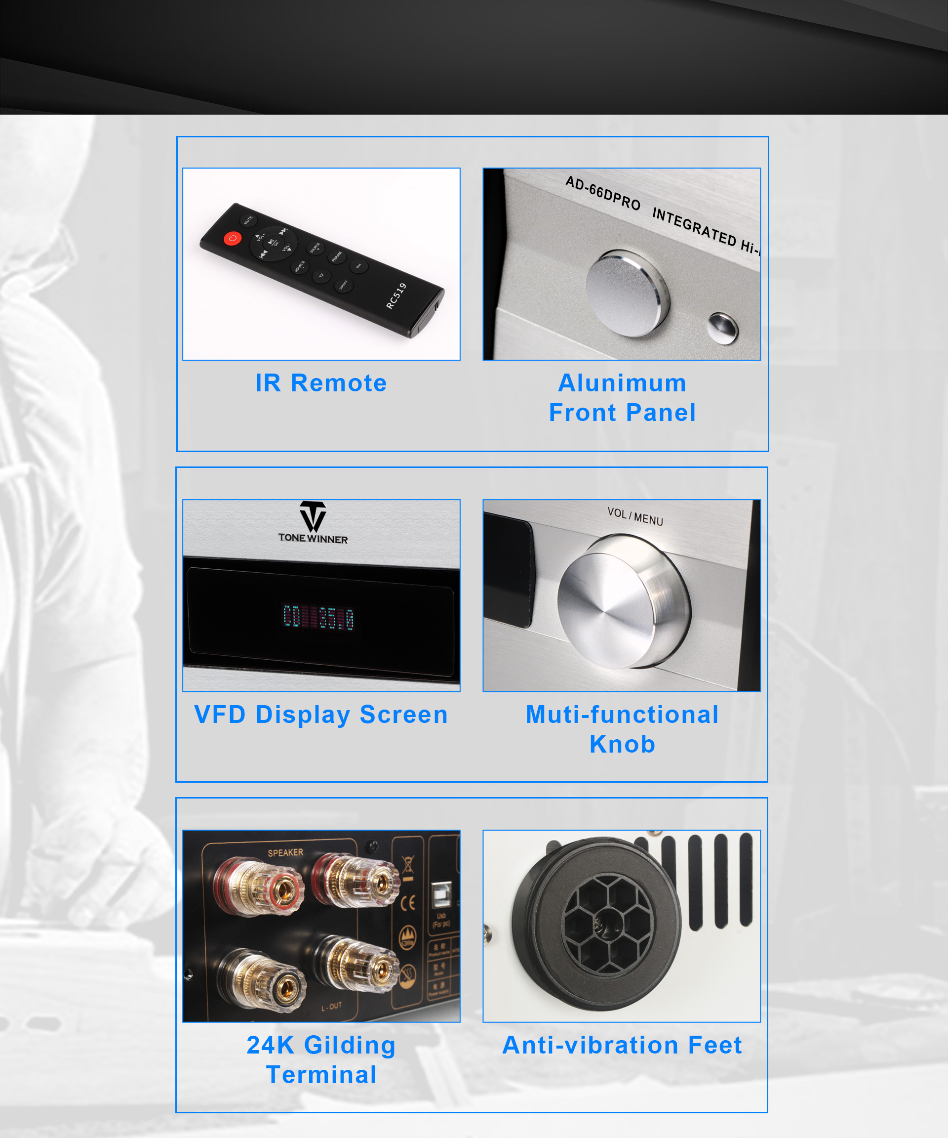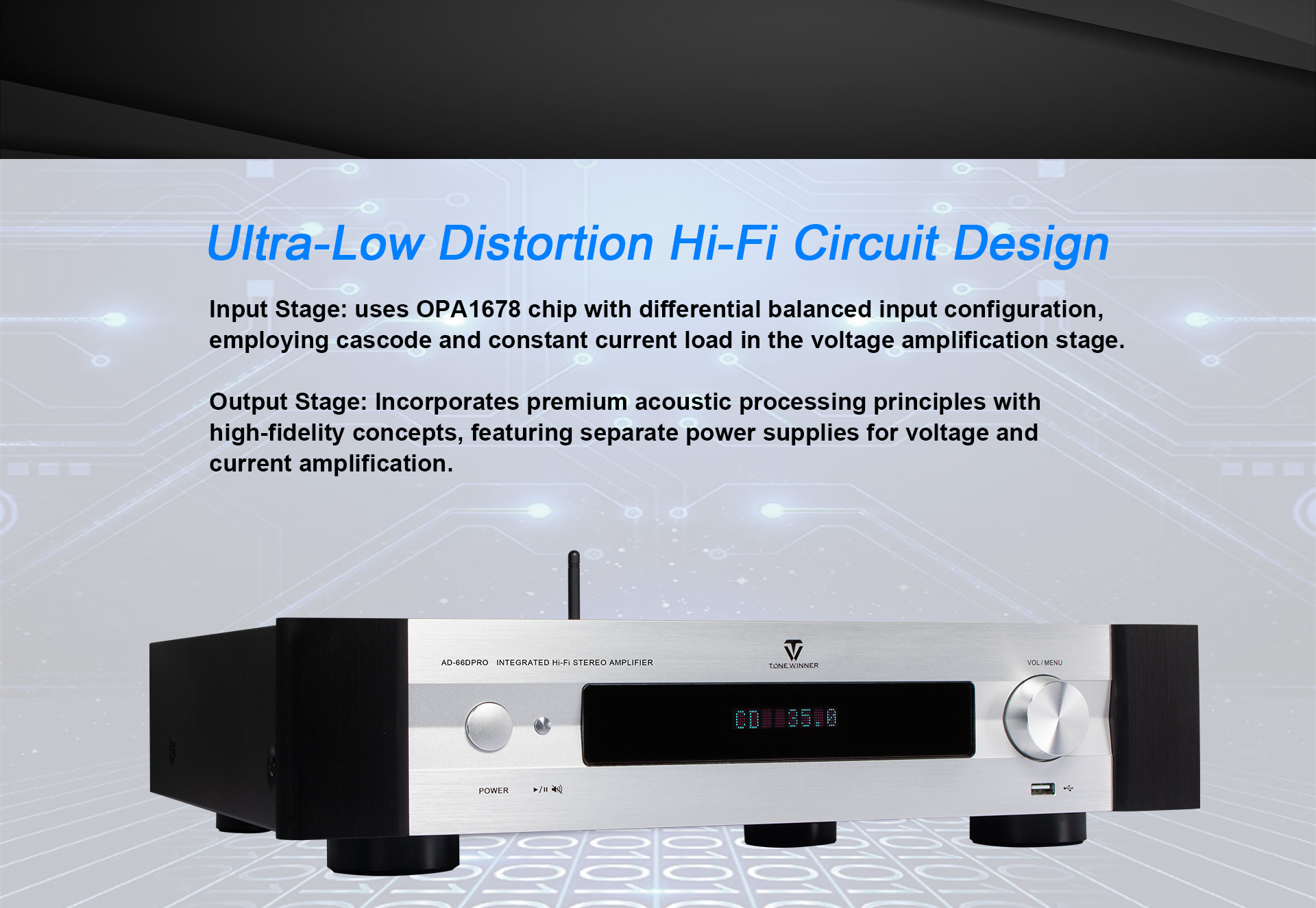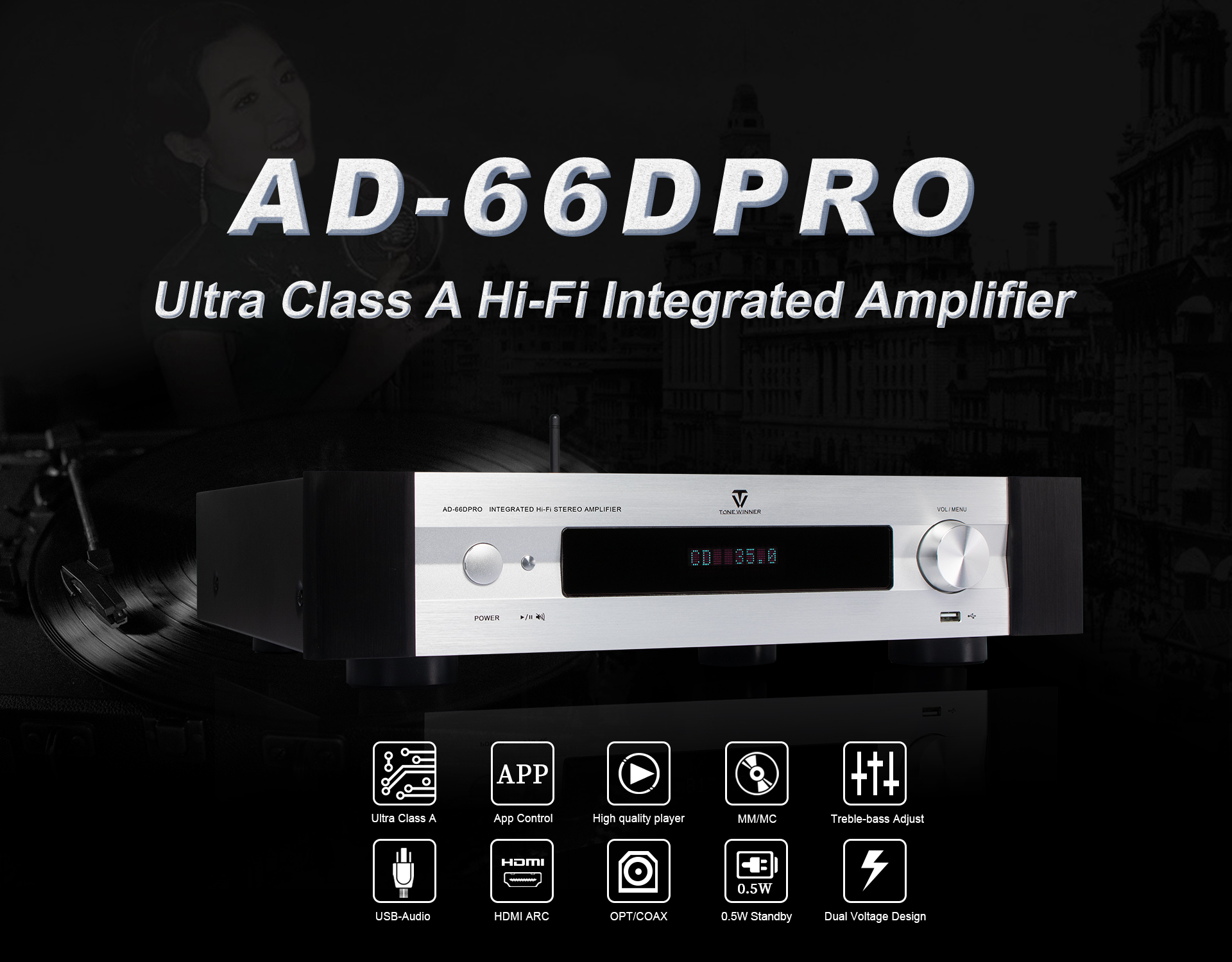 AD-66DPRO — это модернизированная версия AD-66D. Она оснащена новым фоно-интерфейсом MM/MC и новым мобильным приложением. AD-66DPRO сохраняет самые популярные преимущества и улучшается за счет новых функций, что делает её настоятельно рекомендуемым усилителем начального уровня для Hi-Fi-систем.