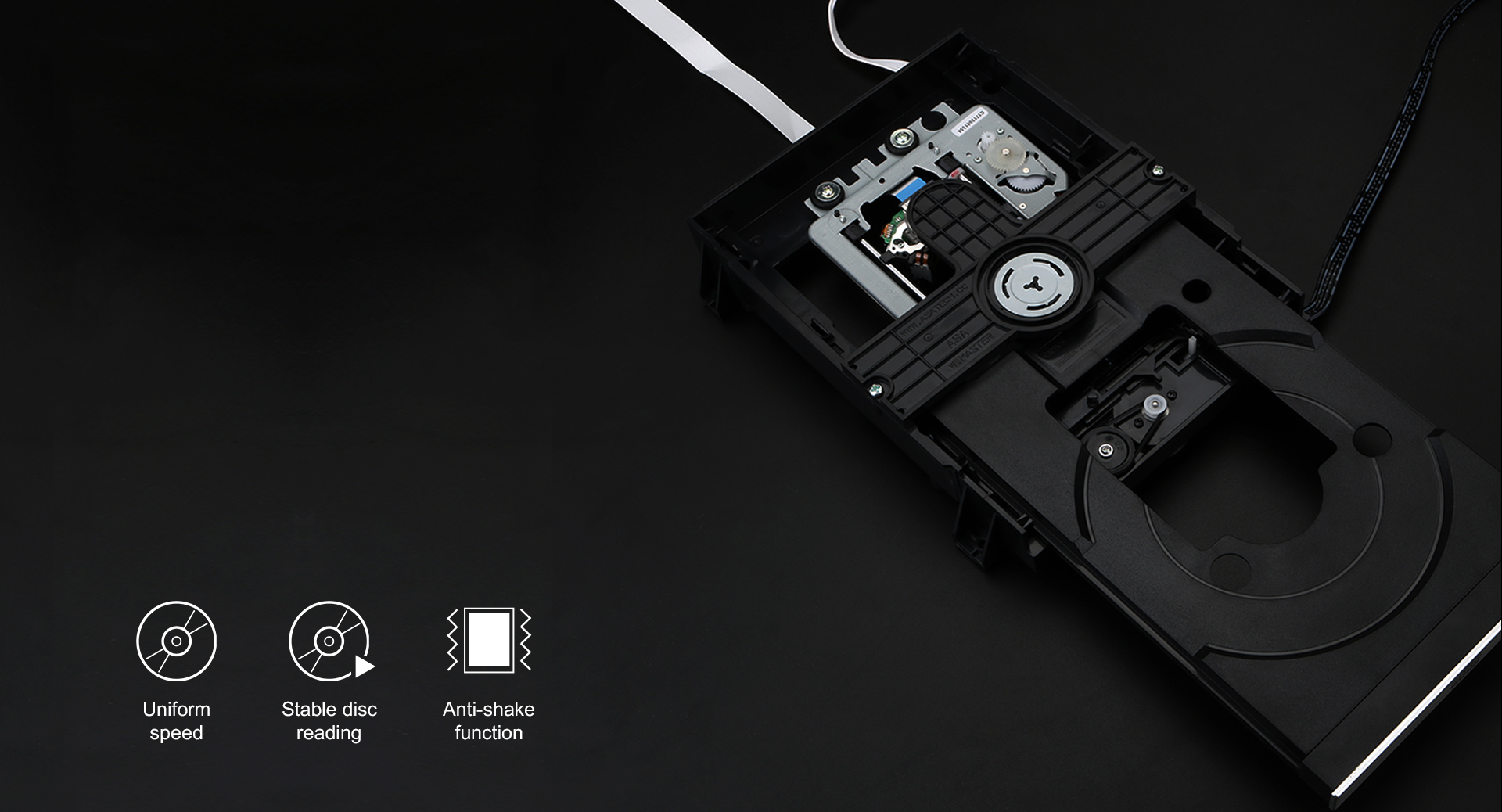 Тщательно подобранный высококачественный механизм, изготовленный по индивидуальному заказу, обеспечивает равномерную скорость вращения и высокую точность считывания дисков. В нижней части шасси установлено толстое металлическое ударопрочное основание для усиления амортизирующего эффекта, что обеспечивает устойчивость и равномерность работы оптической головки, а также отличное чувство равновесия.
