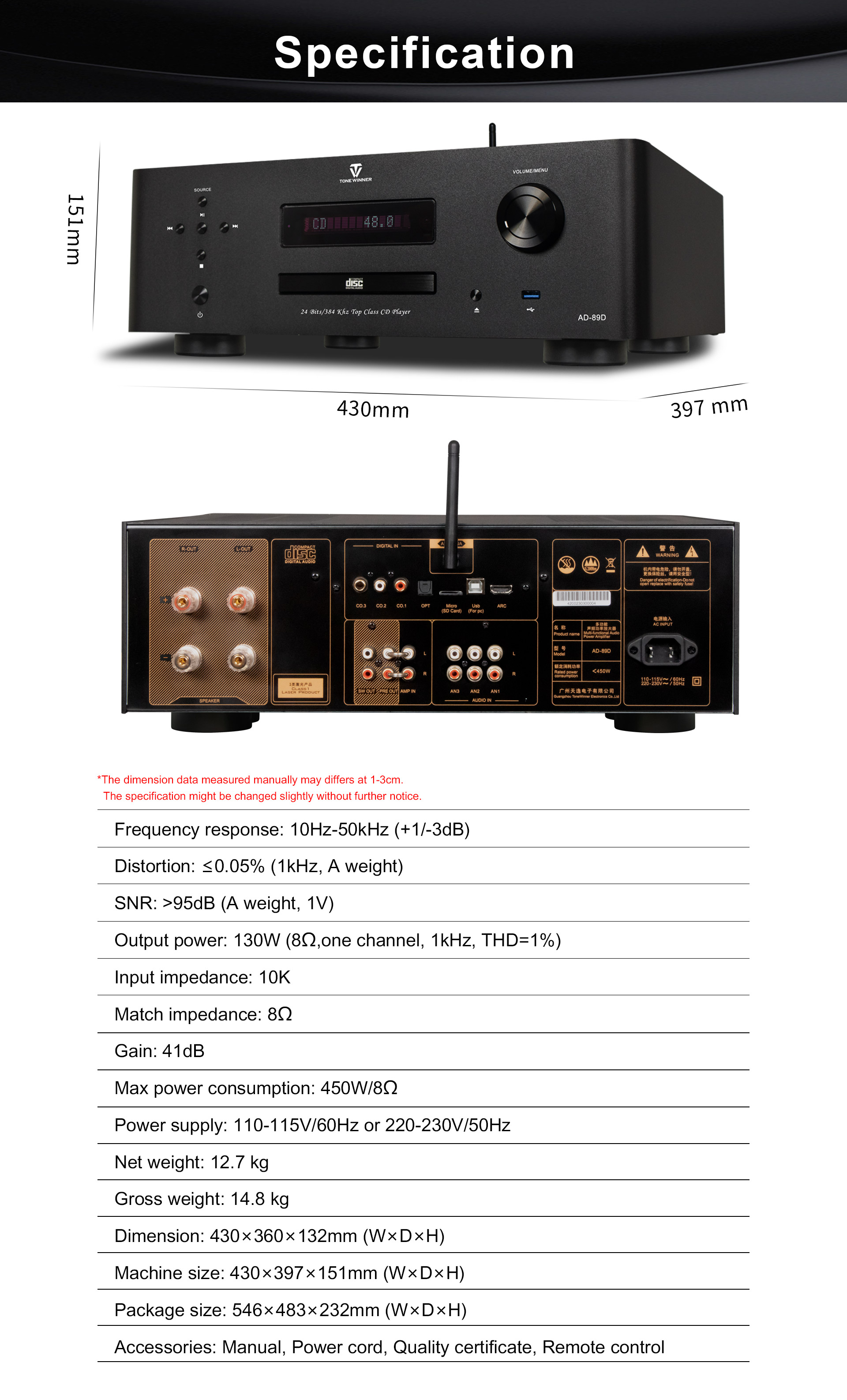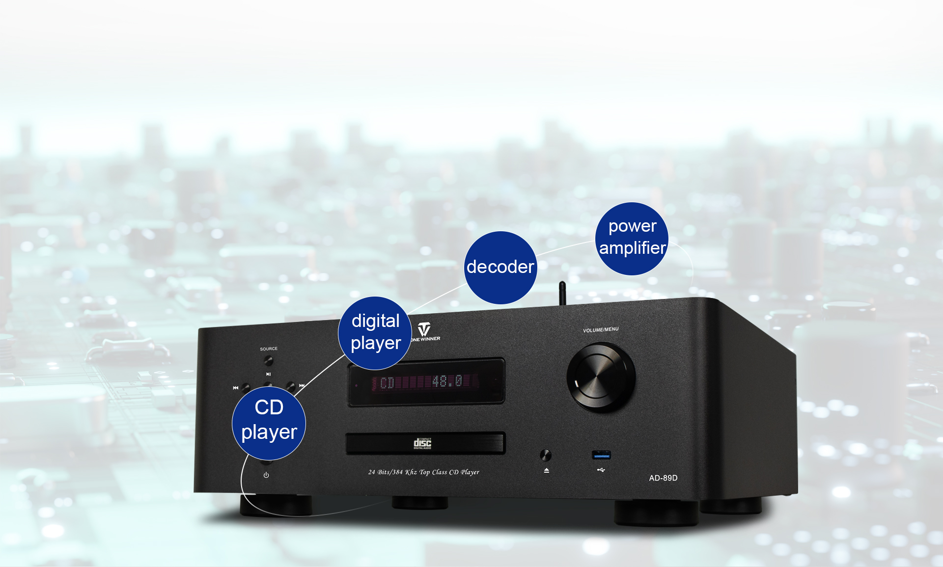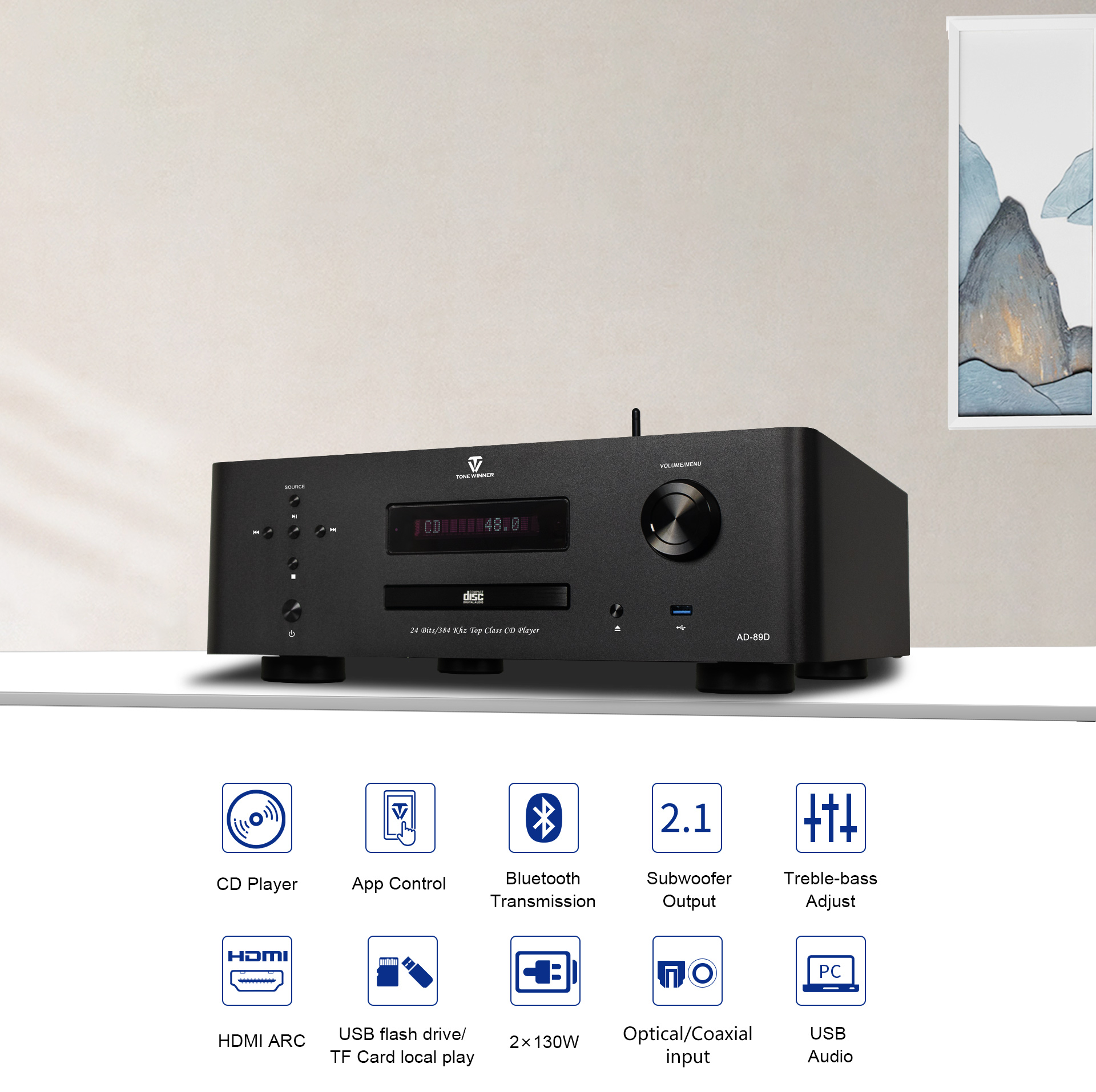 AD-89D — это интегрированный Hi-Fi-усилитель, разработанный на основе 30-летнего технического опыта Tonewinner и отвечающий потребностям рынка в многофункциональности. Этот продукт сочетает в себе множество функций, таких как CD-плеер, потоковый медиаплеер, предусилитель-декодер и усилитель. Продуманная и стабильная схема, прочные и высококачественные материалы обеспечивают надежность и долговечность изделия. Звук насыщенный и тонкий, а соотношение цены и качества исключительно высокое. Это настоящий шедевр нового поколения цифровых Hi-Fi-усилителей.