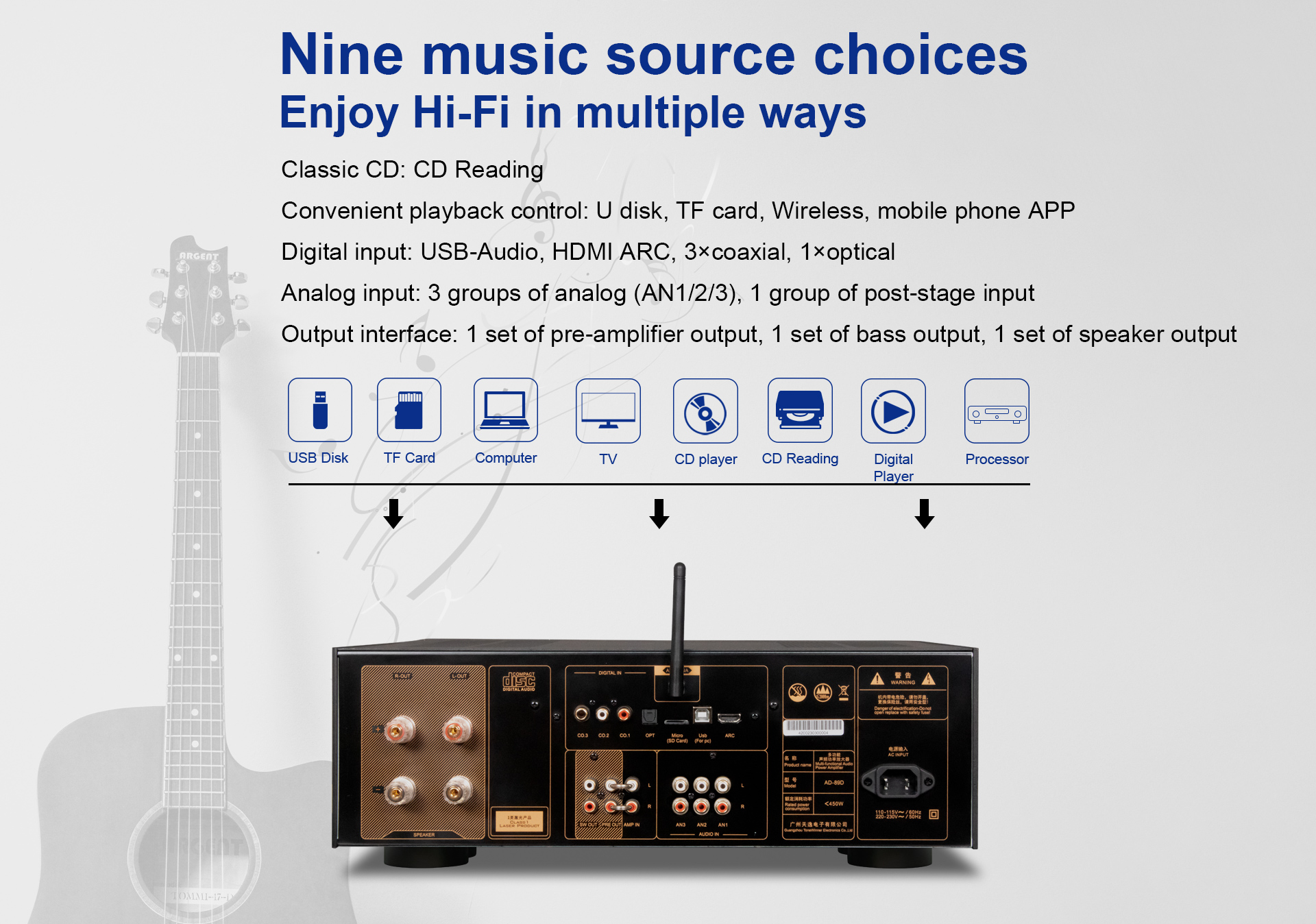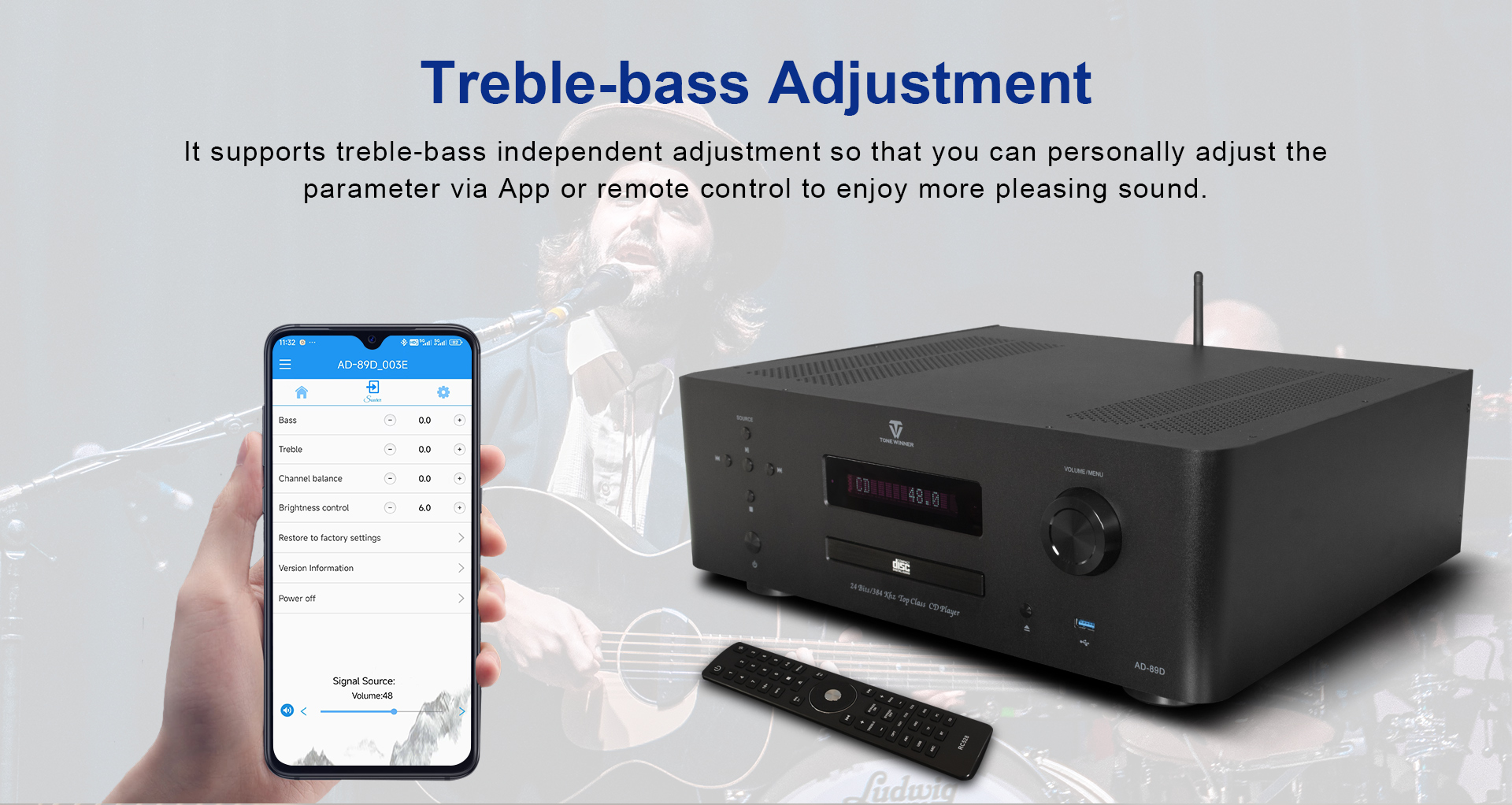 AD-89D — это интегрированный Hi-Fi усилитель, разработанный с учетом 30-летнего технического опыта компании Tonewinner и отвечающий рыночному спросу на многофункциональность. Этот продукт сочетает в себе такие функции, как CD-проигрыватель, проигрыватель потокового мультимедиа, предусилитель-декодер и усилитель. Схема отличается зрелостью и стабильностью, а материалы — прочностью и высоким качеством, что делает продукт надежным и долговечным. Звук округлый и деликатный, соотношение цены и качества чрезвычайно высокое, это представитель нового поколения цифровых Hi-Fi усилителей.