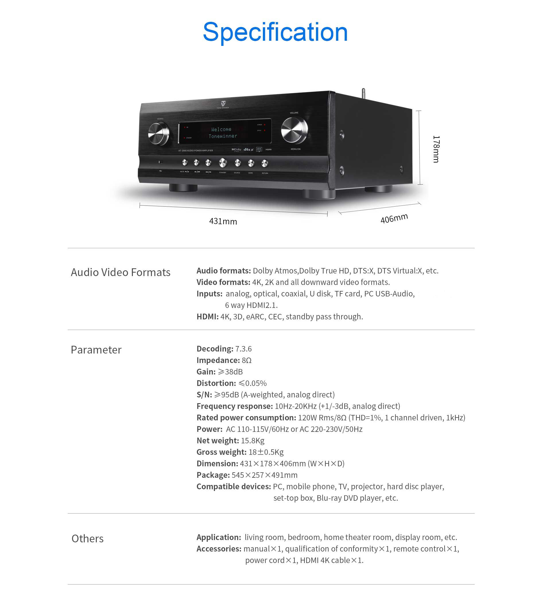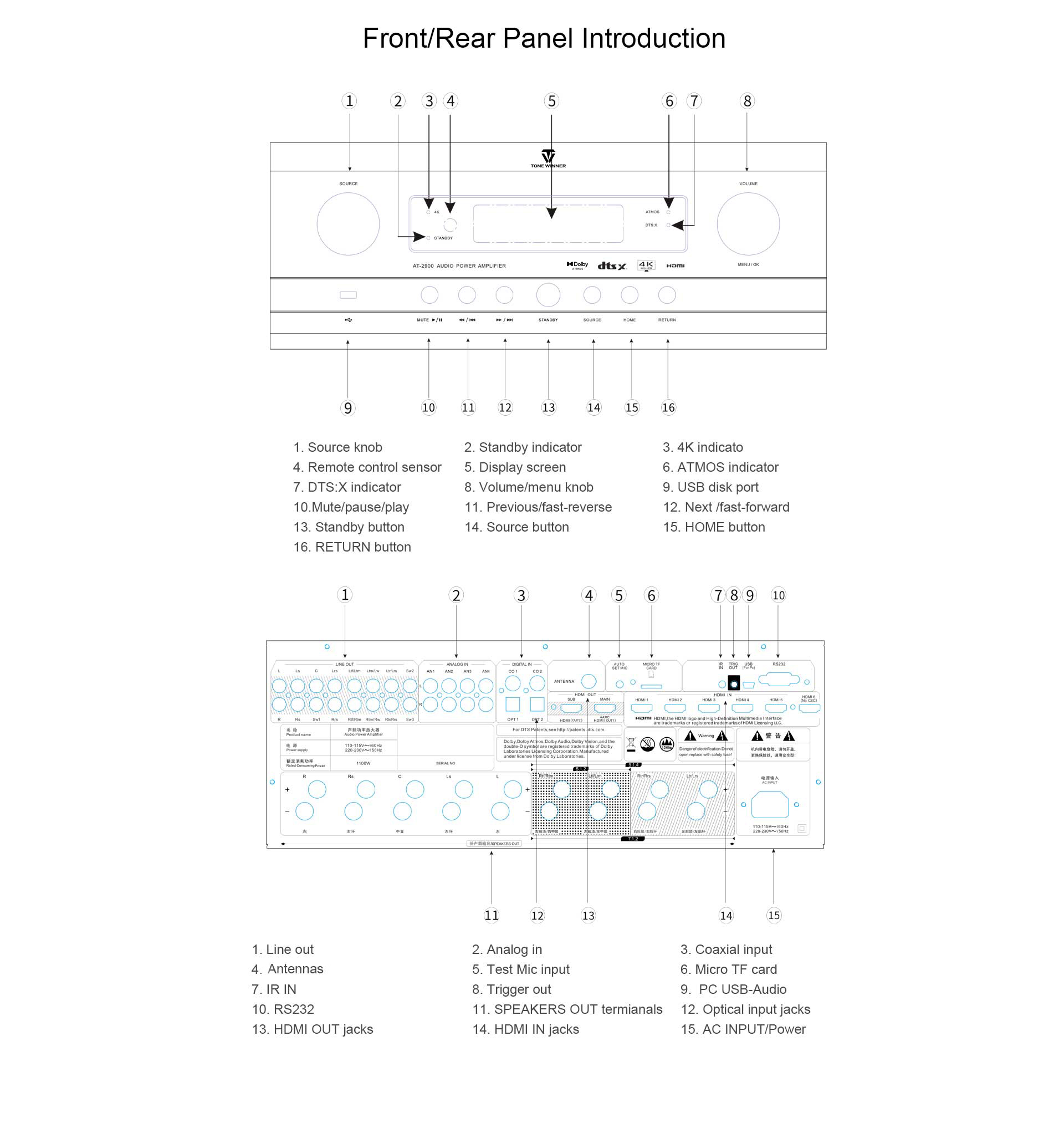 AT-2900 — это интегрированный AV-ресивер с поддержкой Dolby Atmos, DTS:X, Dolby Vision, HDR, 4K и всех их более ранних версий. AT-2900 AVR поддерживает независимое декодирование 14 каналов и имеет 3 выхода для сабвуферов, что позволяет создавать конфигурации 7.3.6 или 9.3.4. Он поддерживает независимую регулировку громкости для каждого канала, включая сабвуферы. Также он поддерживает HDMI 6 входов и 2 выхода, eARC, TF-карту, USB-диск, экранное меню (OSD), RS232, управление через приложение, автоматическую калибровку акустической комнаты и т.д. Это многофункциональный интегрированный усилитель AVR для высококачественного домашнего развлечения.