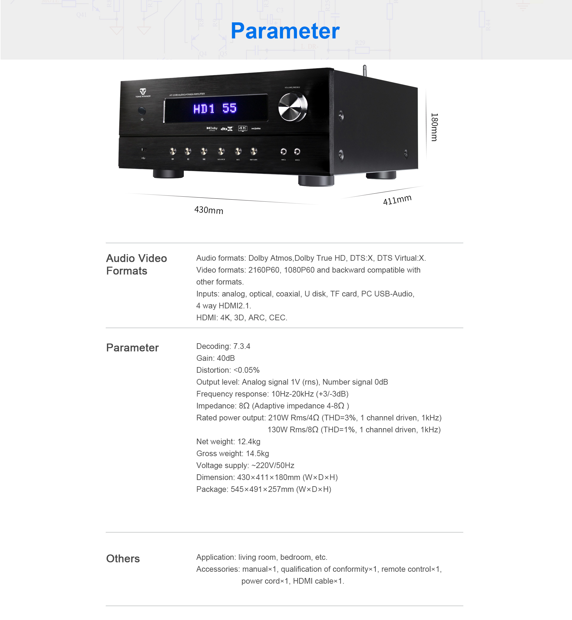 AT-2180 — это профессиональный 7-канальный AV-процессор для домашнего кинотеатра, поддерживающий новейшие форматы иммерсивного звука, включая Dolby Atmos, DTS:X, а также управление через приложения для смартфонов. Он оснащен множеством входных и выходных портов.