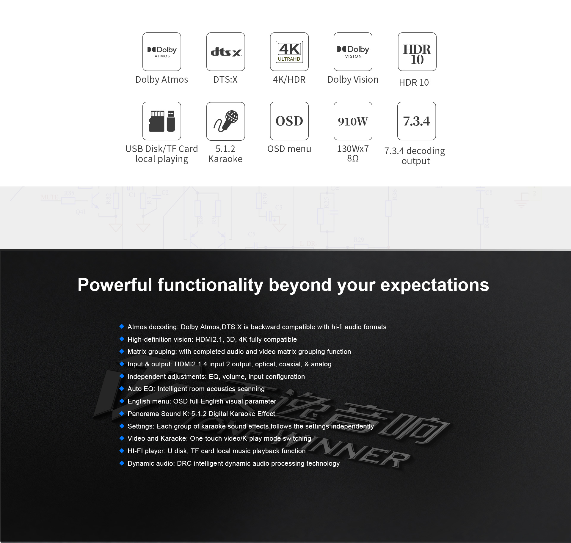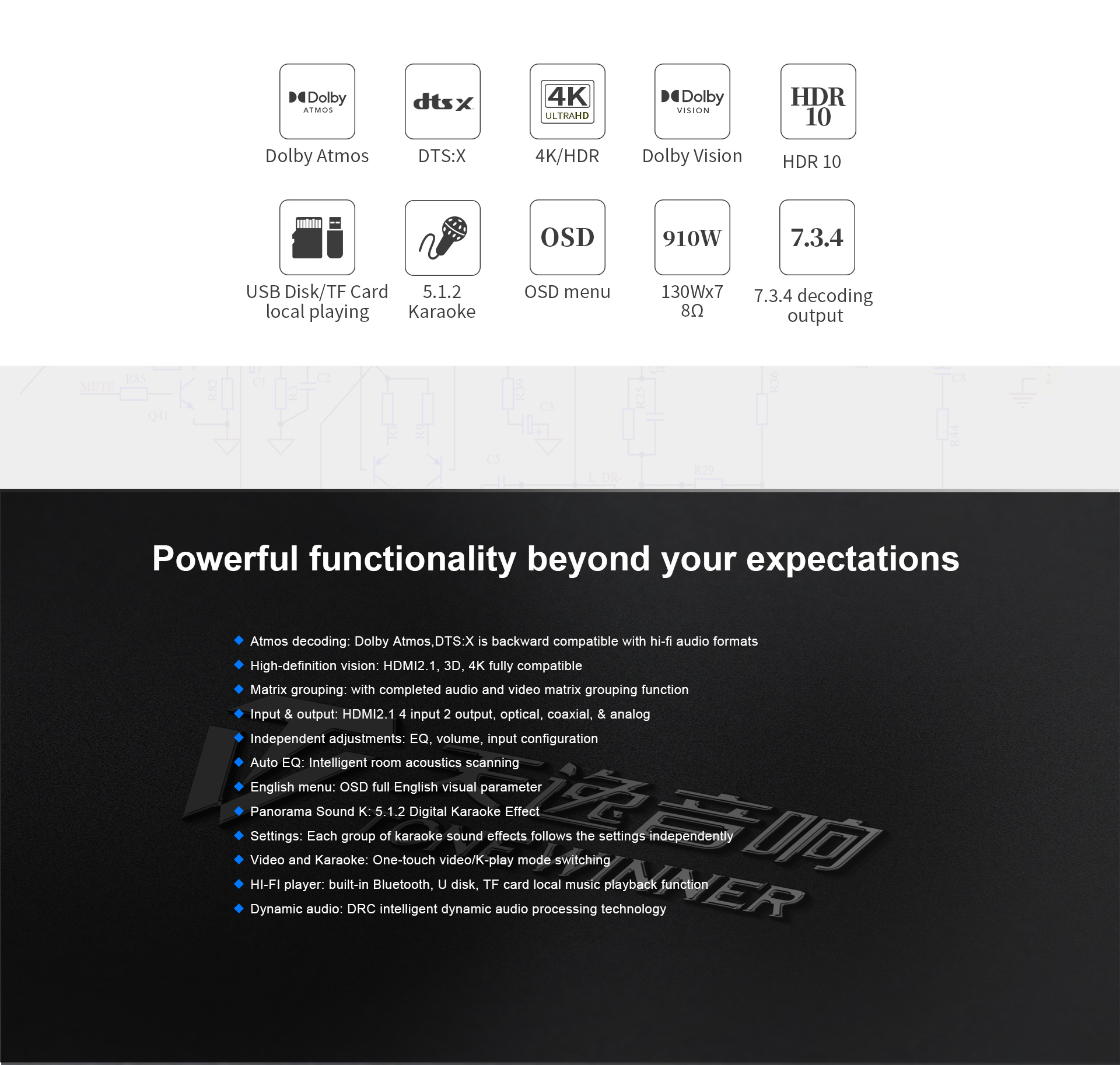 Тщательно отобранные интегрированные компоненты и многослойные печатные платы с золотым покрытием создают прочную основу для воспроизведения звуковых эффектов кинематографического качества.