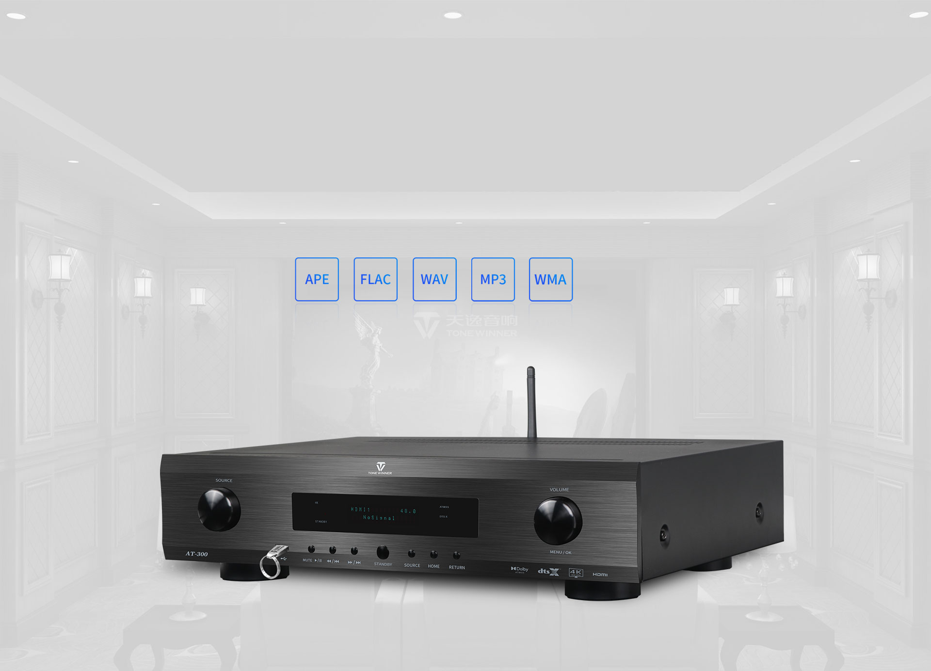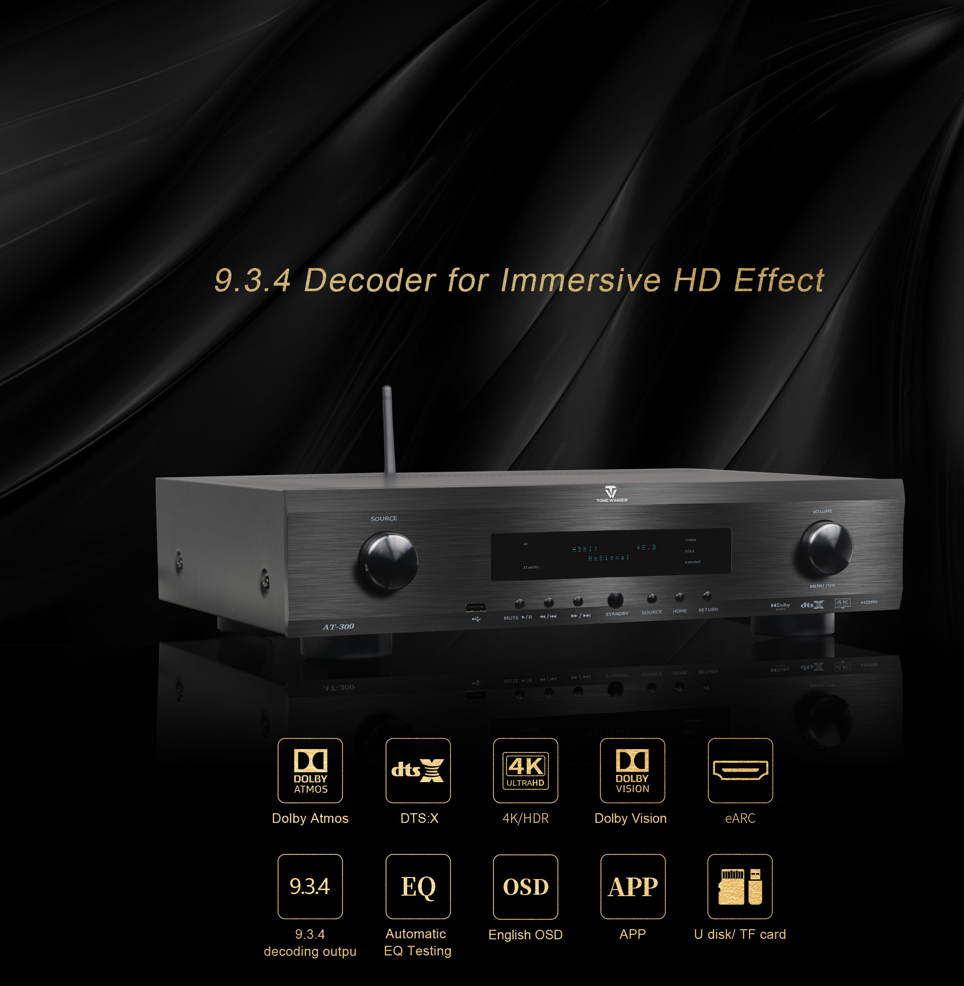 AT-300 — это профессиональный интегрированный аудио-видео декодер для домашнего кинотеатра и музыкального центра, предназначенный для работы в конфигурации 9.3.4. Он разработан и произведен компанией dTonewinner, имеющей более чем 30-летний опыт проектирования и производства, а также инженерами, признанными американской компанией THX. Декодер поддерживает декодирование 4K и сертифицирован для работы с Dolby Atmos, DTS:X и HDMI 2.0.