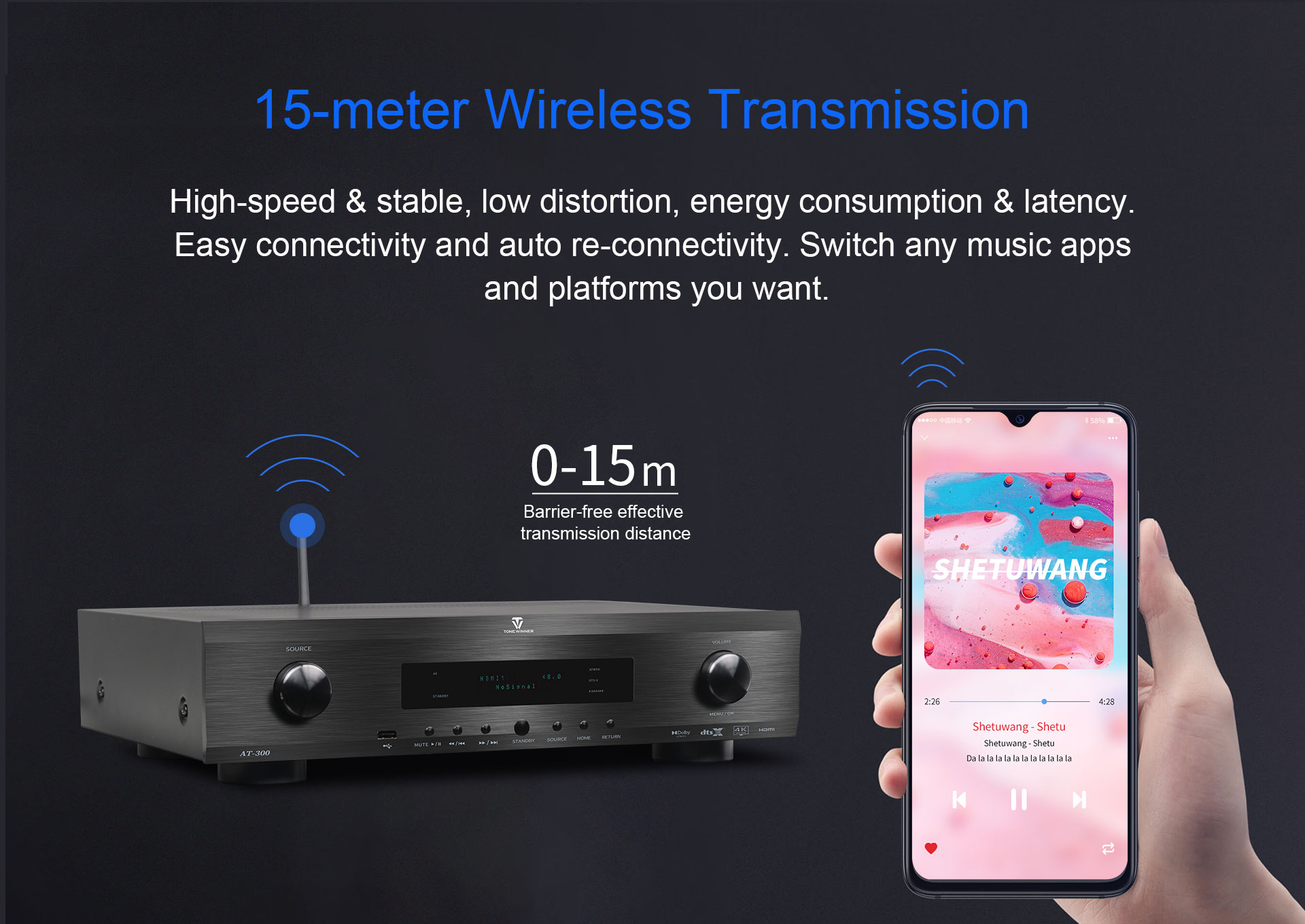 Поддерживает USB-накопители объемом 128 ГБ, карты памяти TF, а также форматы APE, FLAC, WAV, MP3, WMA.