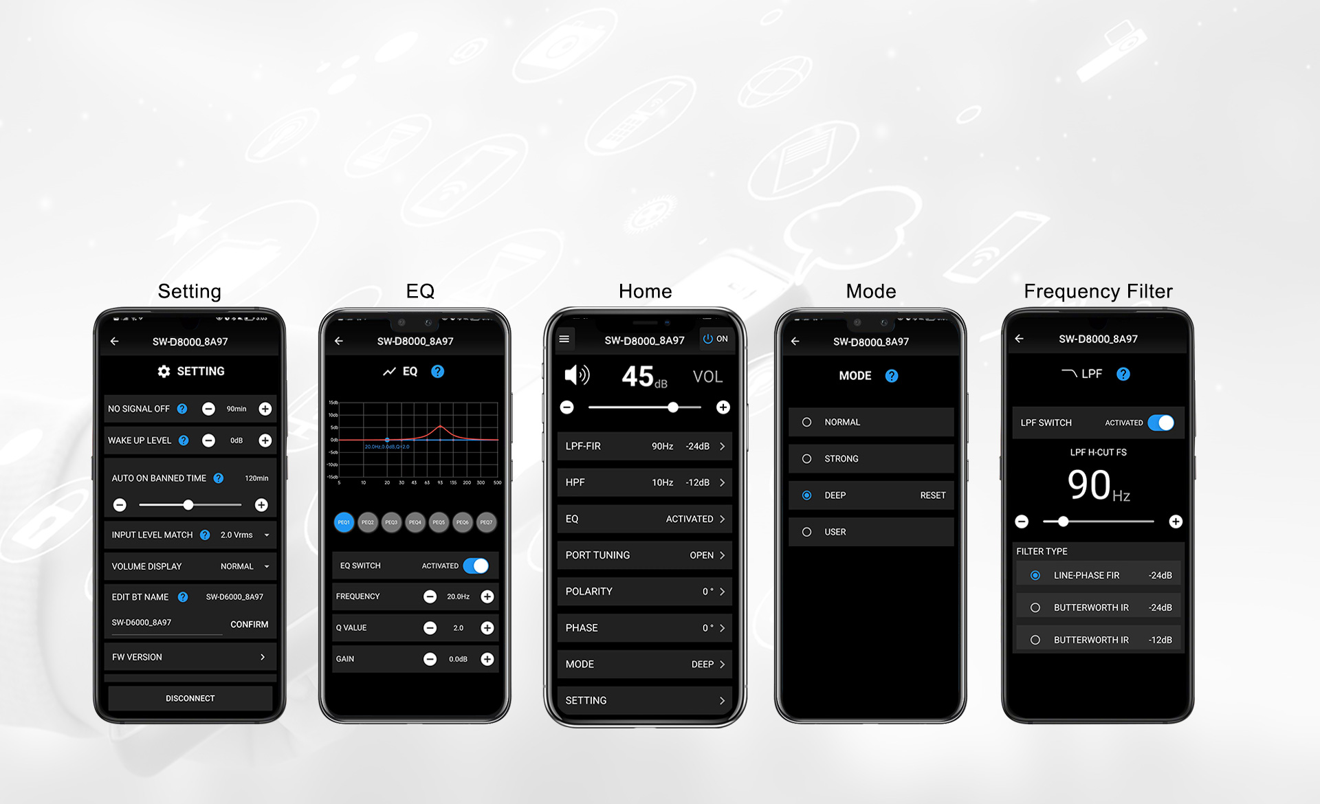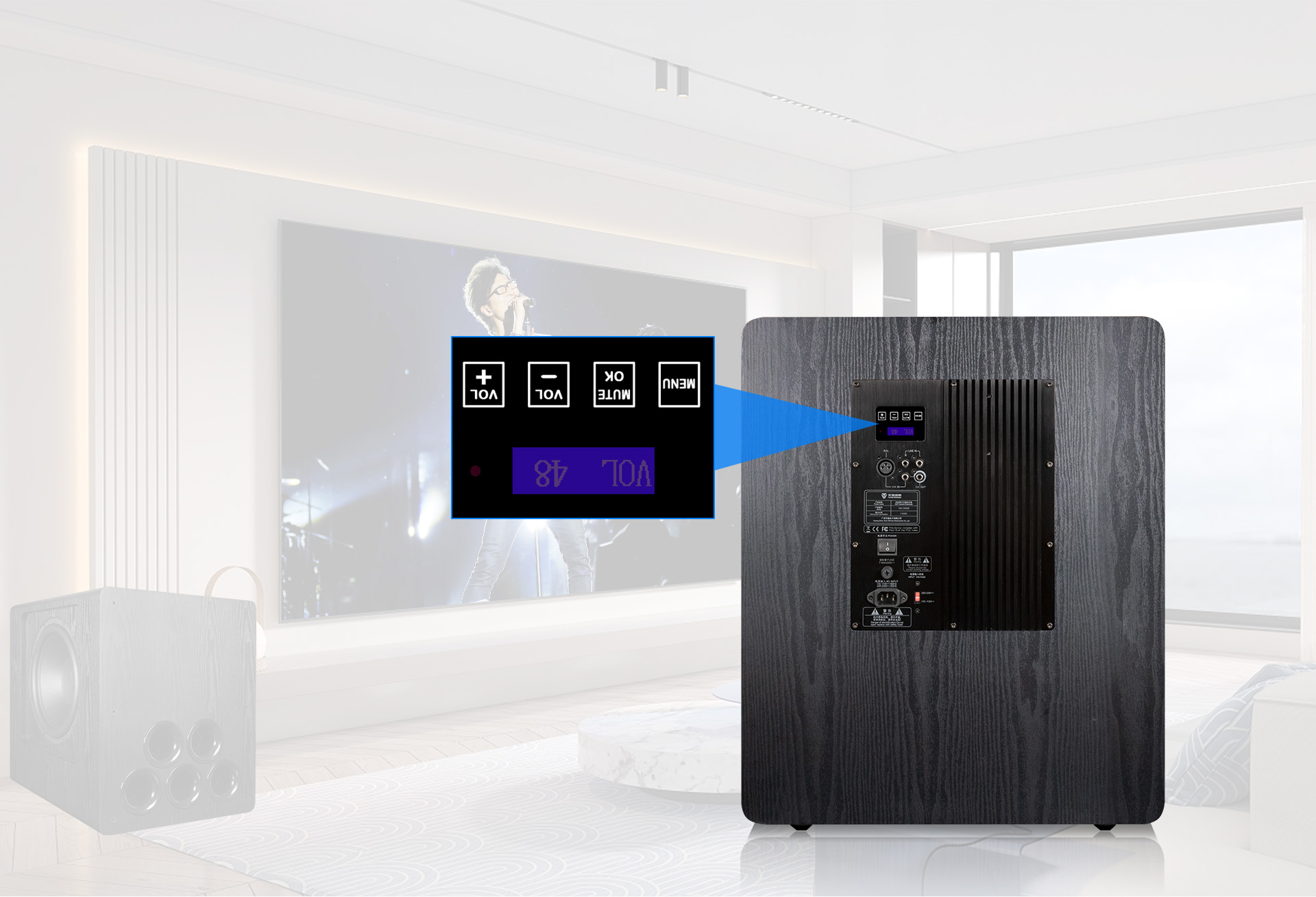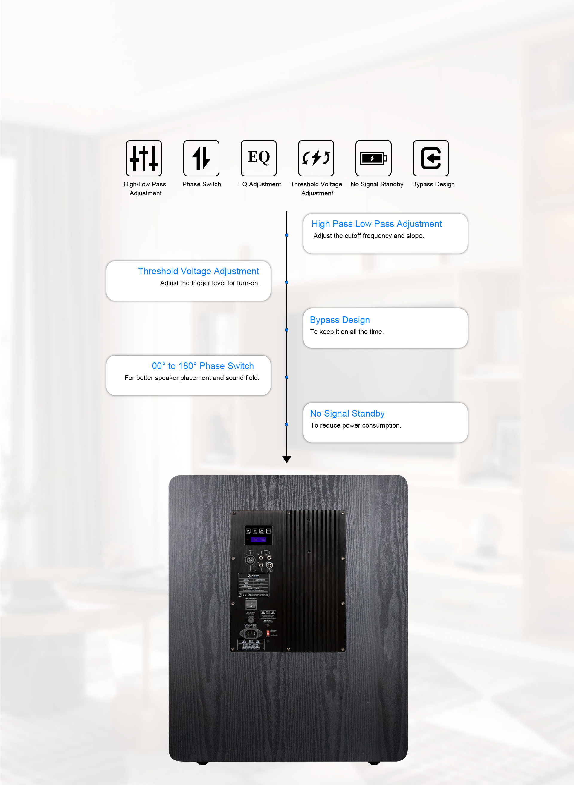 Цифровая обработка DSP, ЖК-дисплей, сенсорные кнопки, управление через приложение, беспроводное обновление прошивки, настройка эквалайзера, регулировка диапазона частот, переключение фазы от 0° до 180°, сбалансированный вход, автоматическое энергосбережение при отсутствии сигнала.