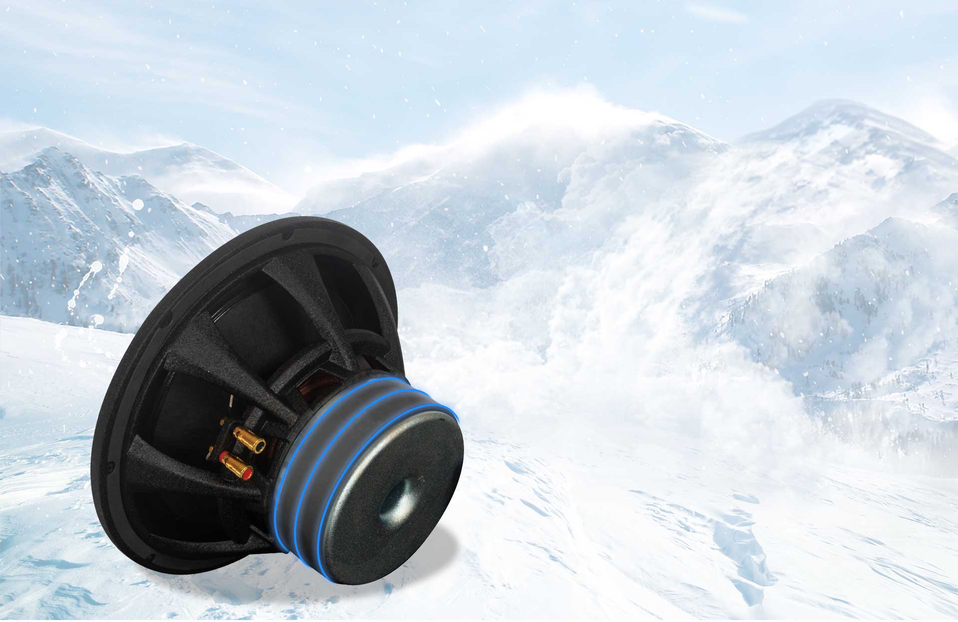 Динамик изготовлен из высококачественного диффузора, литой алюминиевой рамы, эластичного подвеса и 75-миллиметровой звуковой катушки из бескислородной меди для обеспечения большого хода и надежного, мощного и глубокого баса.