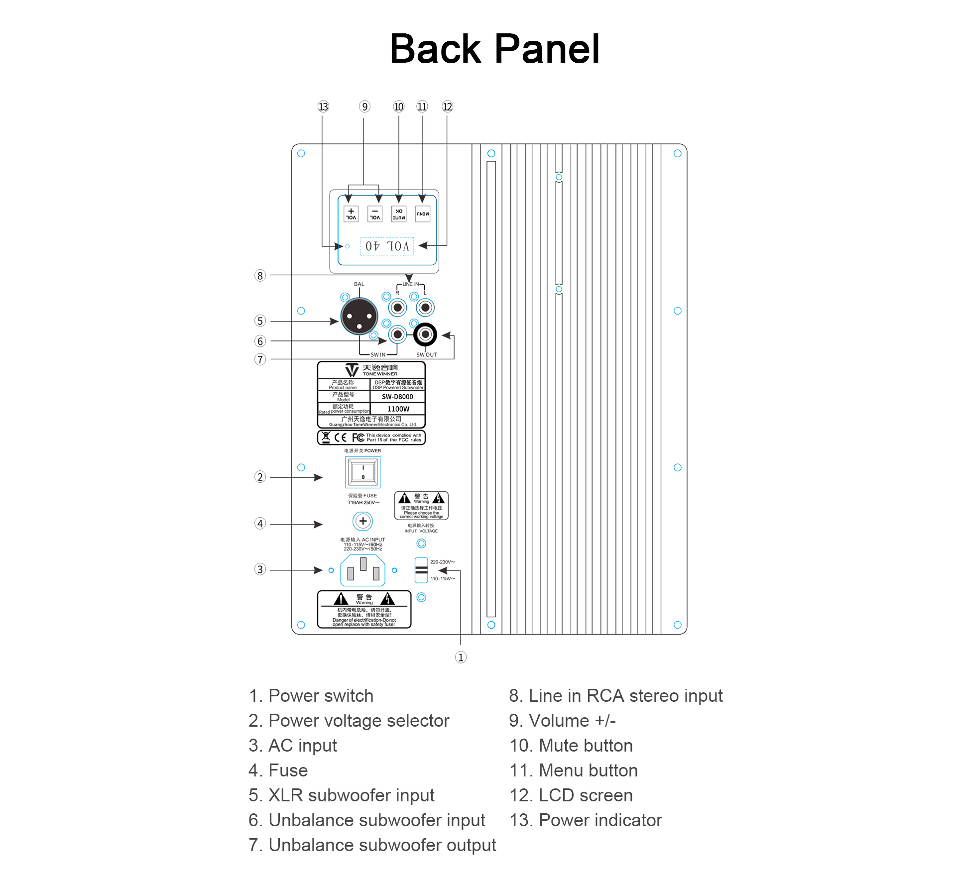 SW-D8000 — это двухканальный 15-дюймовый сабвуфер с DSP-процессором, мощностью 1500 Вт RMS/3 Ом и 8000 Вт пиковой/3 Ом. В нём используется усилитель класса D со встроенным DSP-процессором. Он оснащён встроенным Bluetooth и приложением для регулировки громкости, настройки портов, полярности, фазы от 0° до 180°, фильтра верхних частот (HPF), фильтра нижних частот (LPF), наклона АЧХ, эквалайзера, режима ожидания без сигнала, уровня сигнала пробуждения, согласования уровня входного сигнала и четырёх режимов прослушивания. Встроенный Bluetooth-интерфейс и приложение Tonewinner поддерживают Tonewinner. Tonewinner входит в десятку лучших аудиобрендов Китая и обладает более чем 30-летним опытом разработки и производства акустических систем. Будучи оригинальным поставщиком, Tonewinner всегда рад приветствовать дистрибьюторов, дилеров, партнёров и клиентов по всему миру.