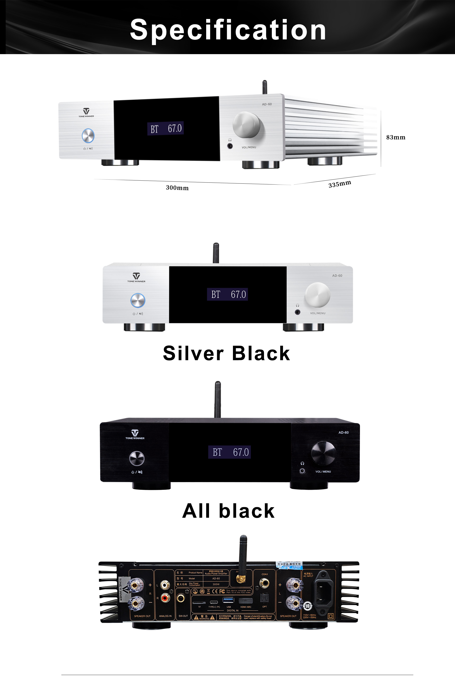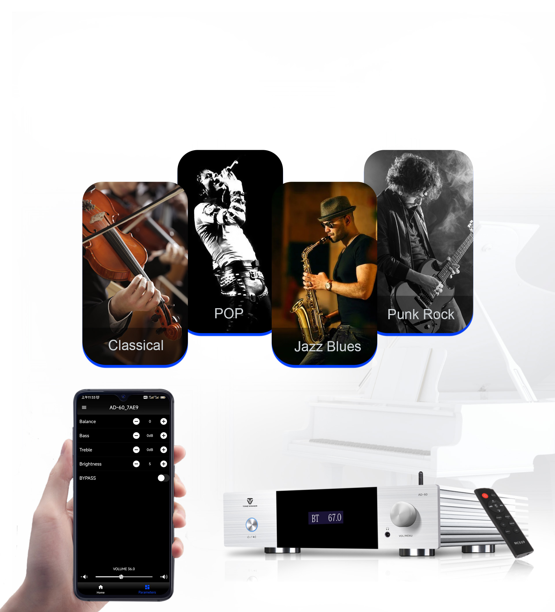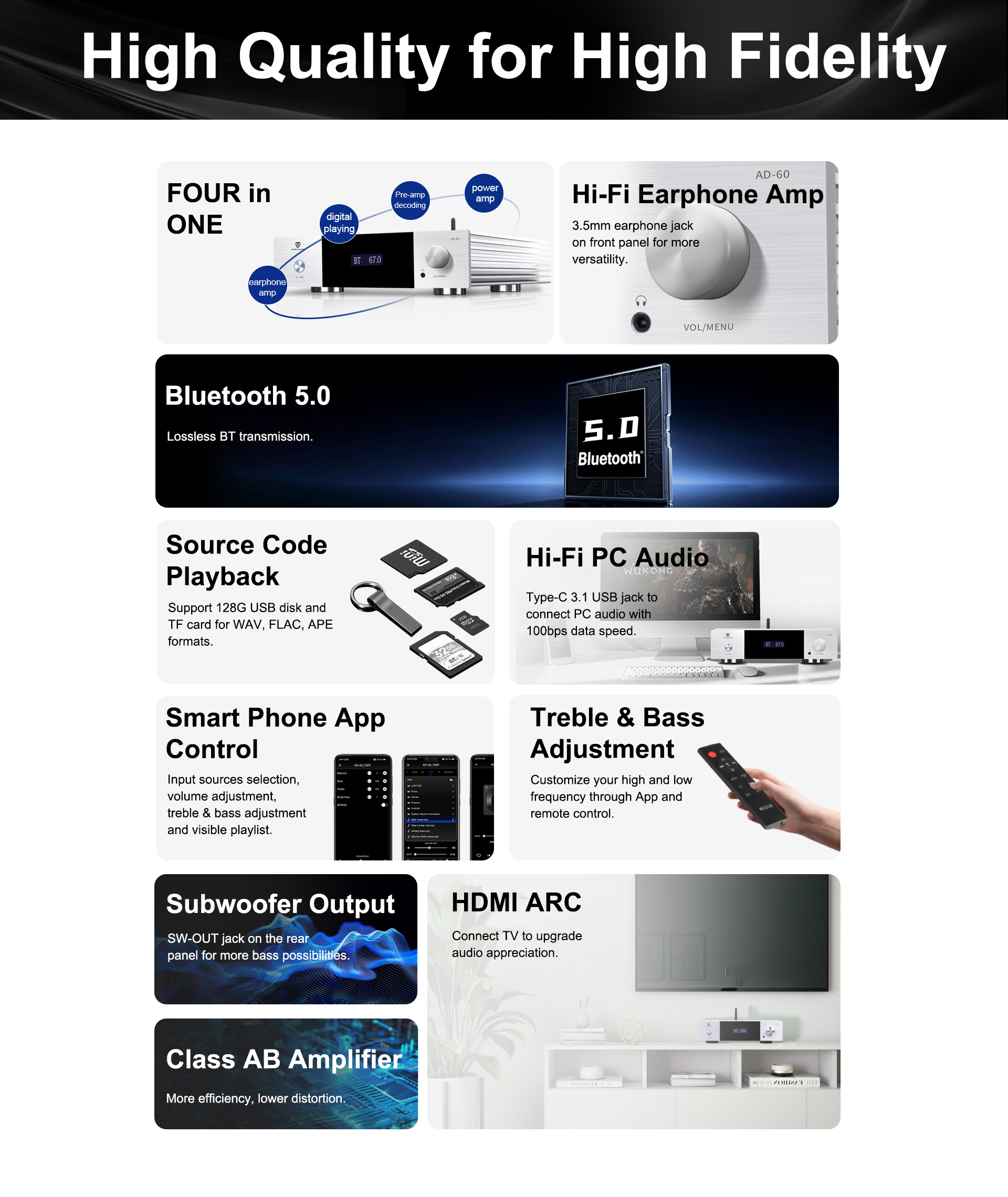 AD-60 — это интегрированный усилитель мощности класса AB для системы 2.1. Он сочетает в себе функции декодирования предварительного усилителя, усилителя мощности, цифрового воспроизведения и усилителя для наушников, поддерживает Bluetooth 5.0, USB-накопители, карты памяти TF, управление через приложение на смартфоне и цифровые входы, включая оптический, коаксиальный и PC USB-Audio. Он изначально разработан и изготовлен из качественных материалов и компонентов, обеспечивающих аналитическое звучание. Это модный и экономичный усилитель мощности для ваших высококачественных аудиоразвлечений.