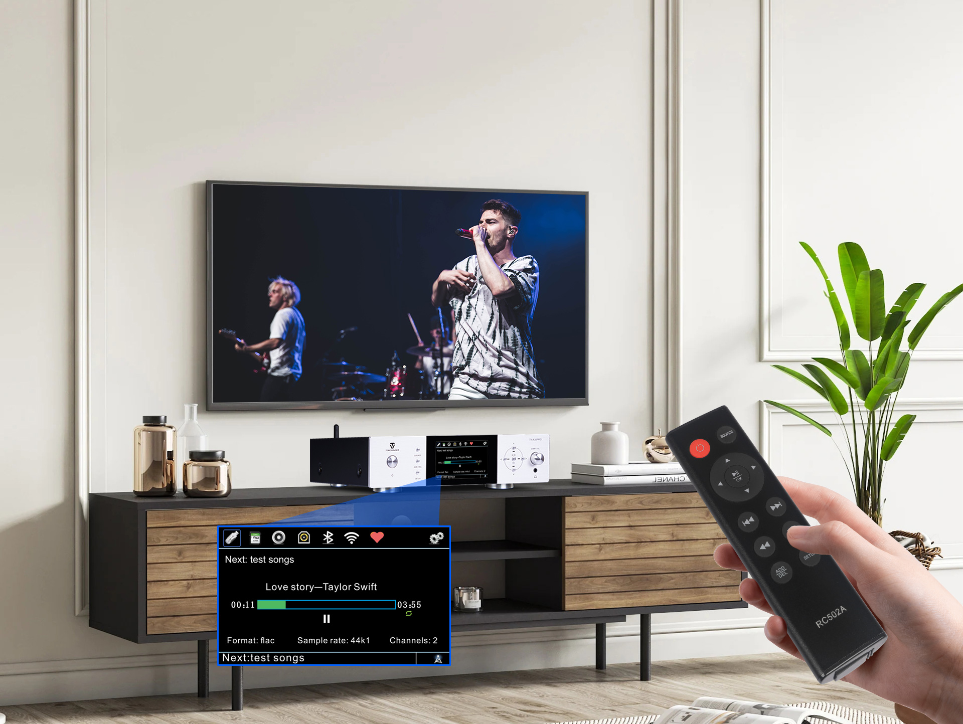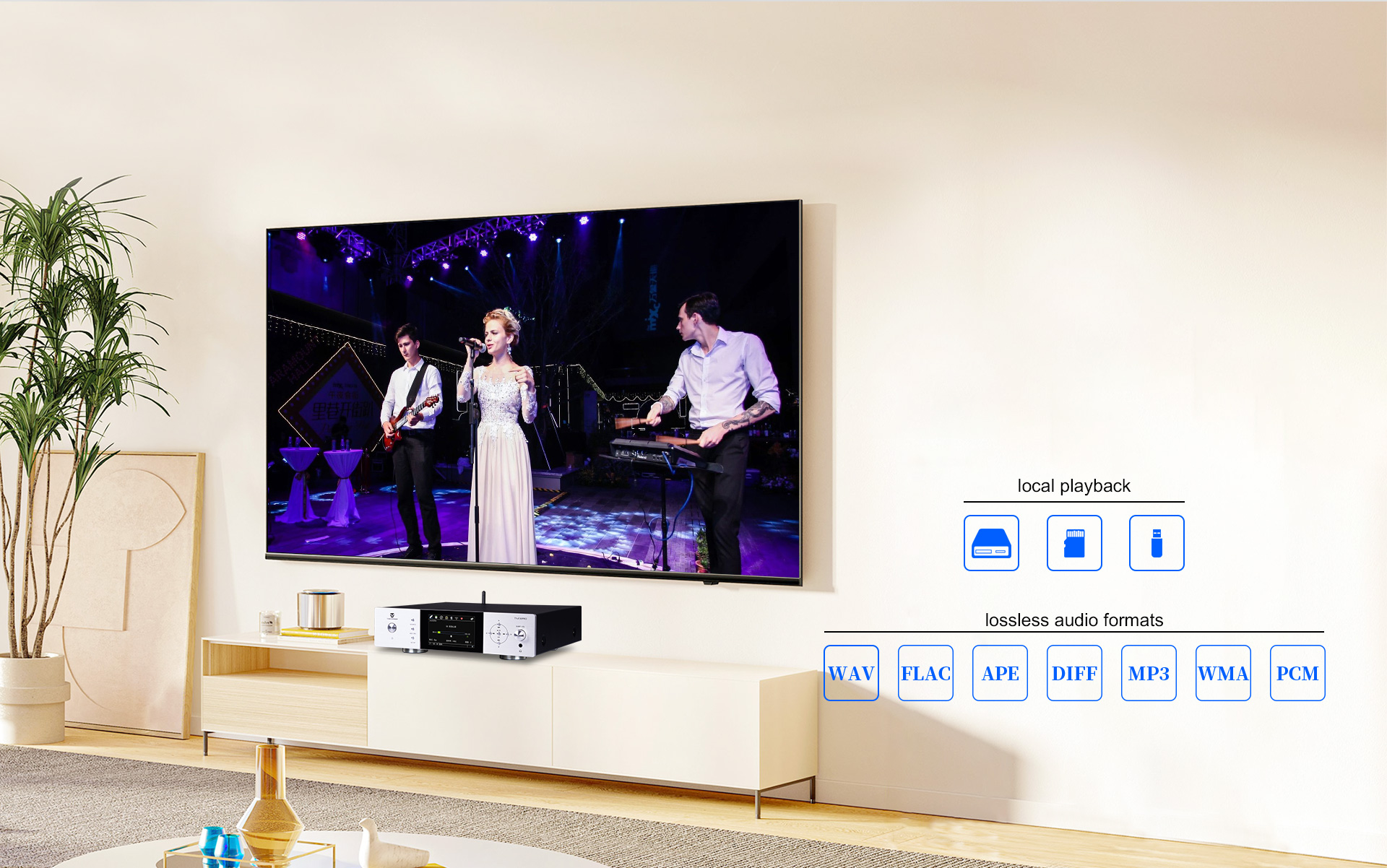 Поддерживает локальное воспроизведение с жесткого диска объемом 2 ТБ, USB-накопителей и карт TF.