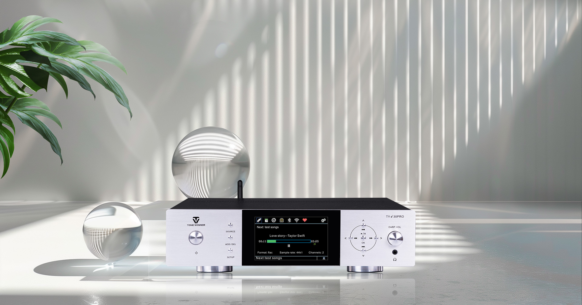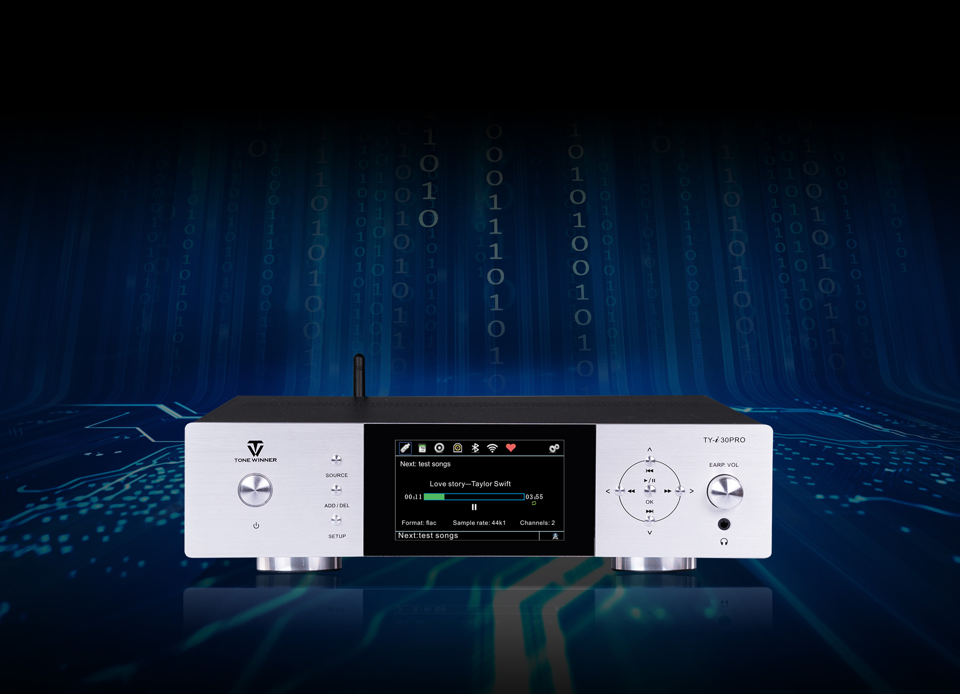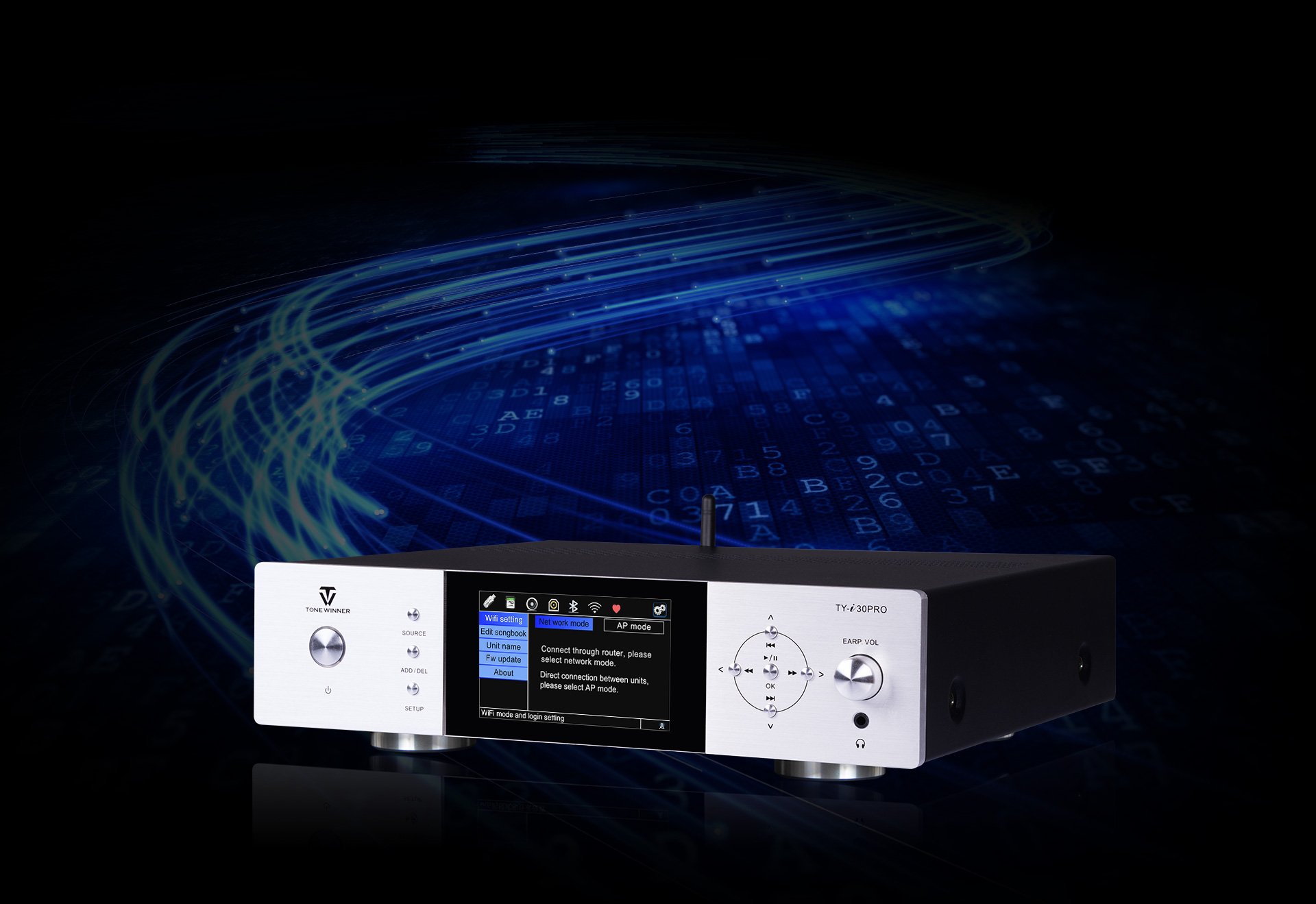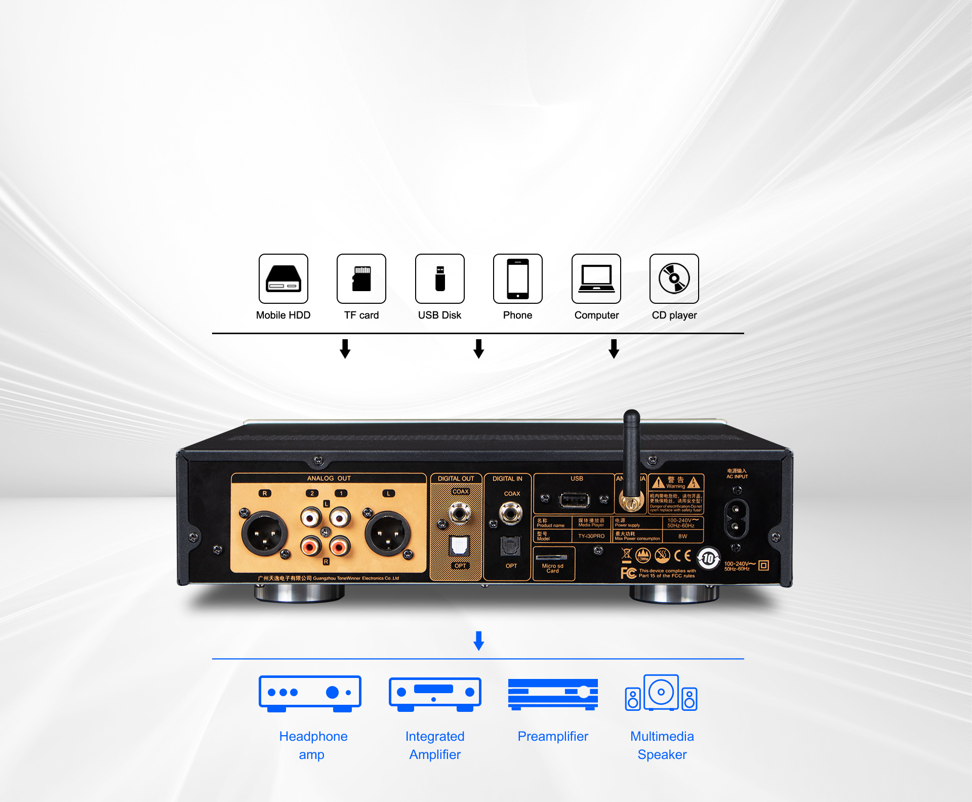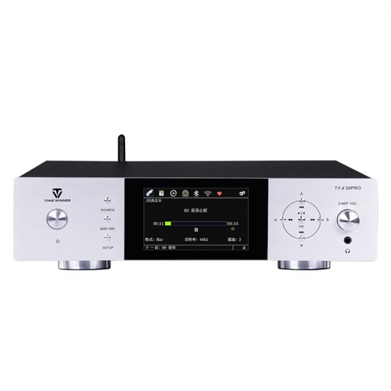 TY-i30PRO — новый многофункциональный медиаплеер от ToneWinner. Он поддерживает воспроизведение музыки с мобильных телефонов, iPad, ноутбуков и других устройств через DLNA, AIRPLAY или Bluetooth. TY-i30PRO поддерживает локальное воспроизведение с жёстких дисков объёмом 2 ТБ, карт памяти TF и USB-накопителей, поддерживает аудиоформаты без потерь, такие как WAV/FLAC и APE, а также оснащён 3,5-мм разъёмом для наушников на передней панели, а также поддерживает оптический и коаксиальный входы/выходы цифрового потока PCM 192 кГц/24 бит.