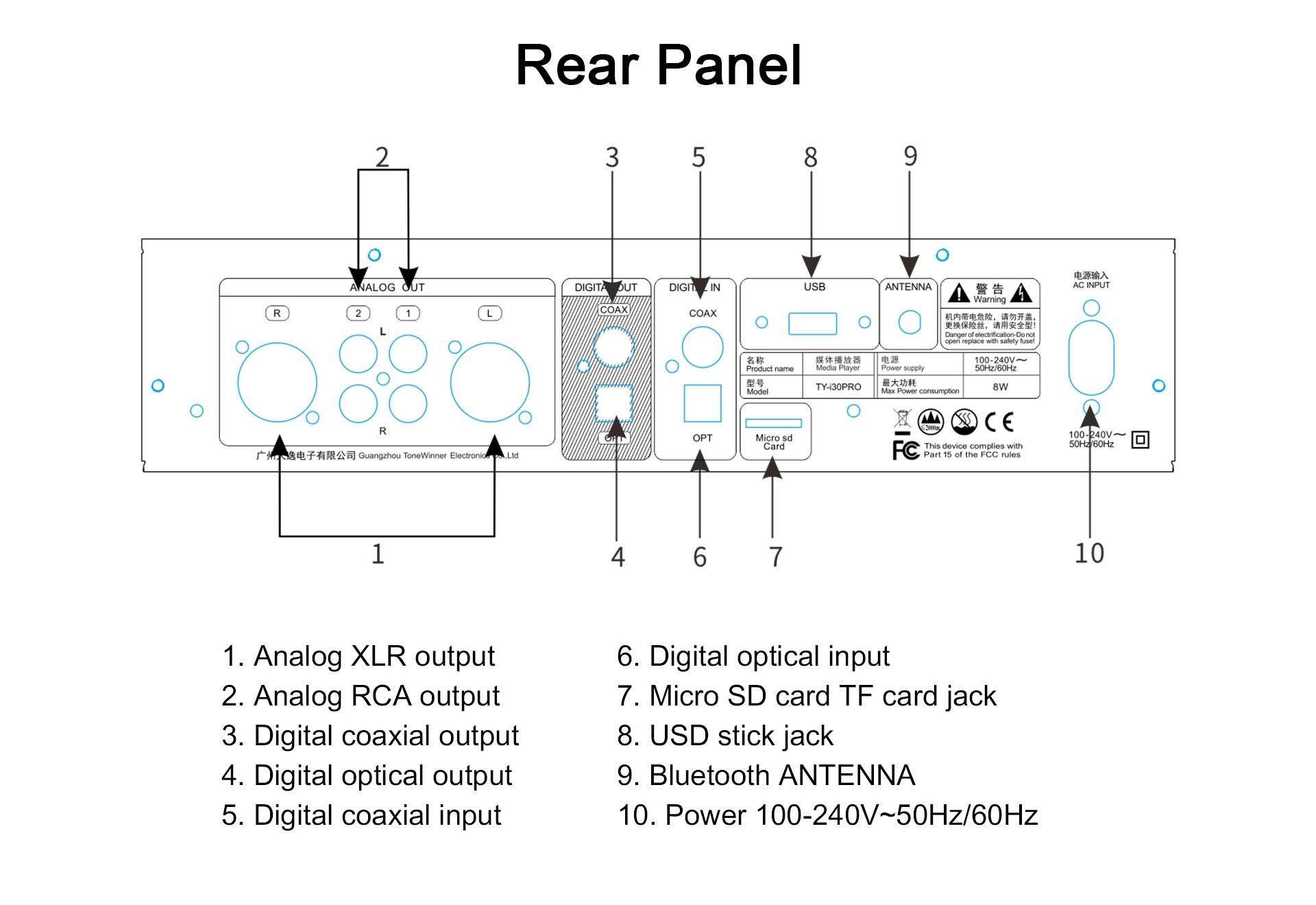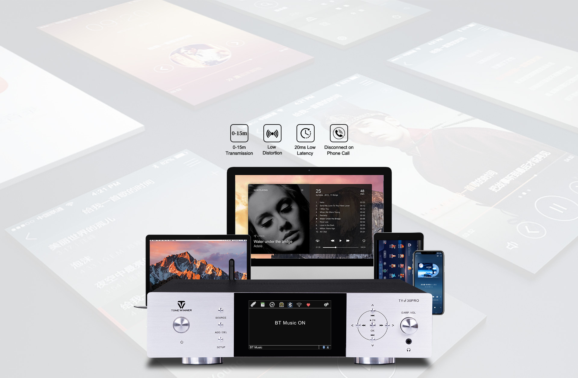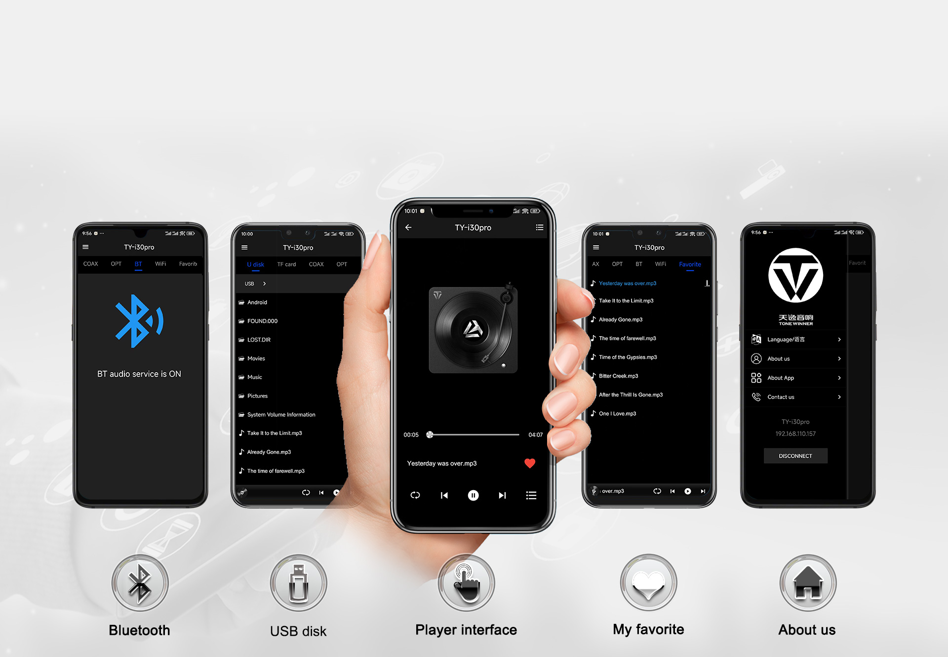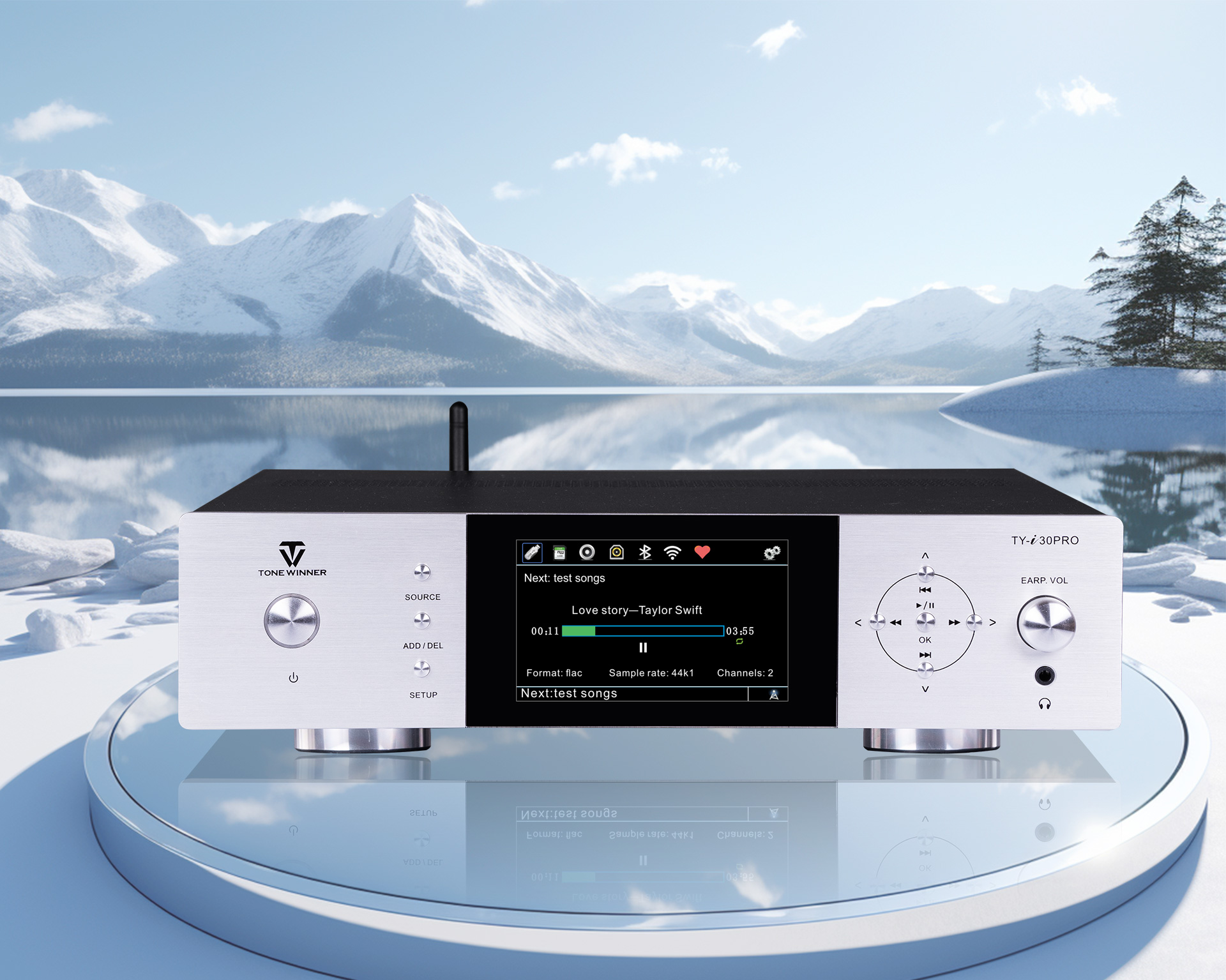 TY-i30PRO — новый многофункциональный медиаплеер от ToneWinner. Он поддерживает воспроизведение музыки с мобильных телефонов, iPad, ноутбуков и других устройств через DLNA, AIRPLAY или Bluetooth. TY-i30PRO поддерживает локальное воспроизведение с жёстких дисков объёмом 2 ТБ, карт памяти TF и USB-накопителей, поддерживает аудиоформаты без потерь, такие как WAV/FLAC и APE, а также оснащён 3,5-мм разъёмом для наушников на передней панели, а также поддерживает оптический и коаксиальный входы/выходы цифрового потока PCM 192 кГц/24 бит.