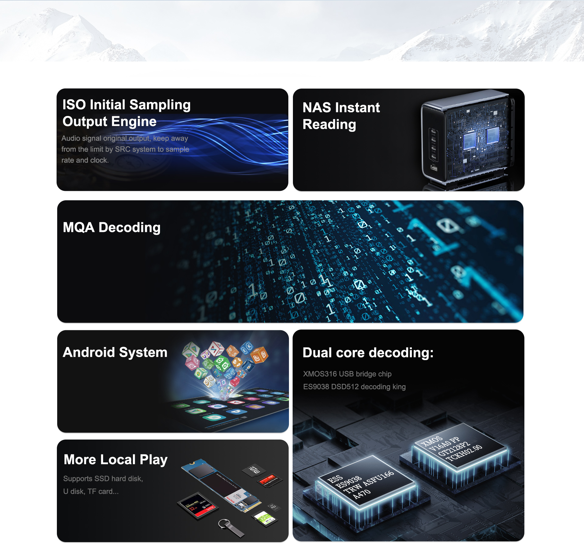 Входы локального воспроизведения: жесткий диск M.2 SSD, 2 порта USB 3.0 (расширяемые OTG), 1 карта Micro SD.