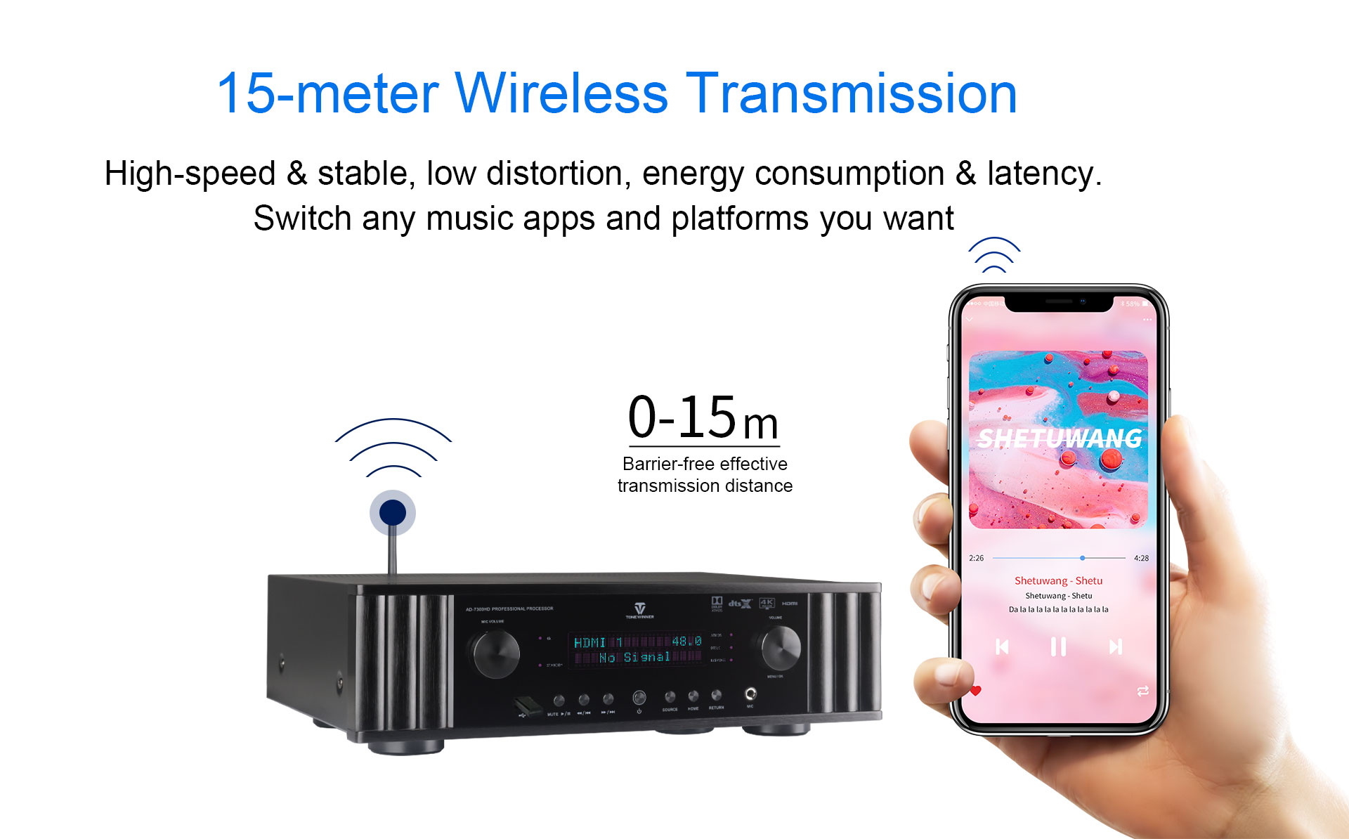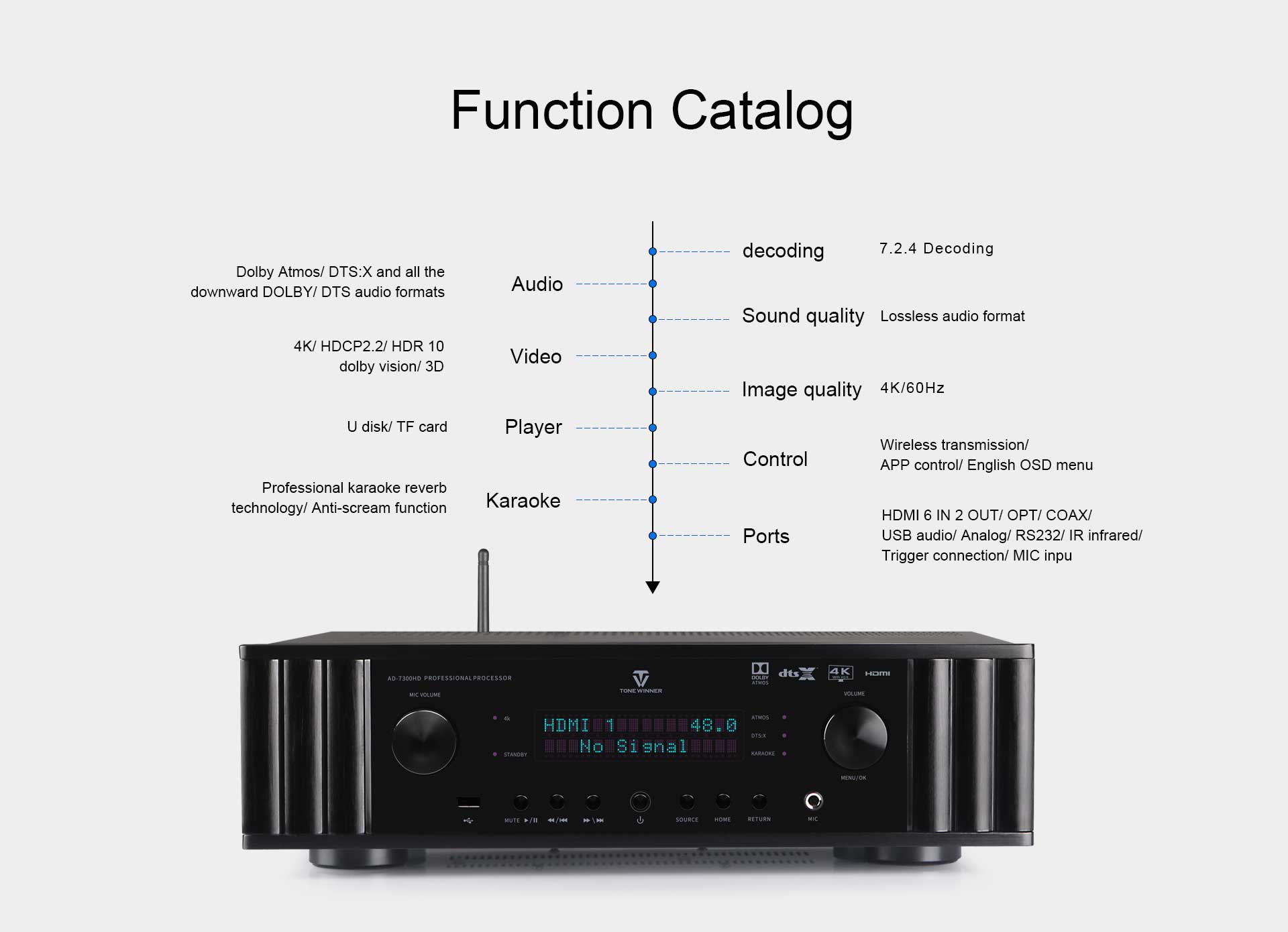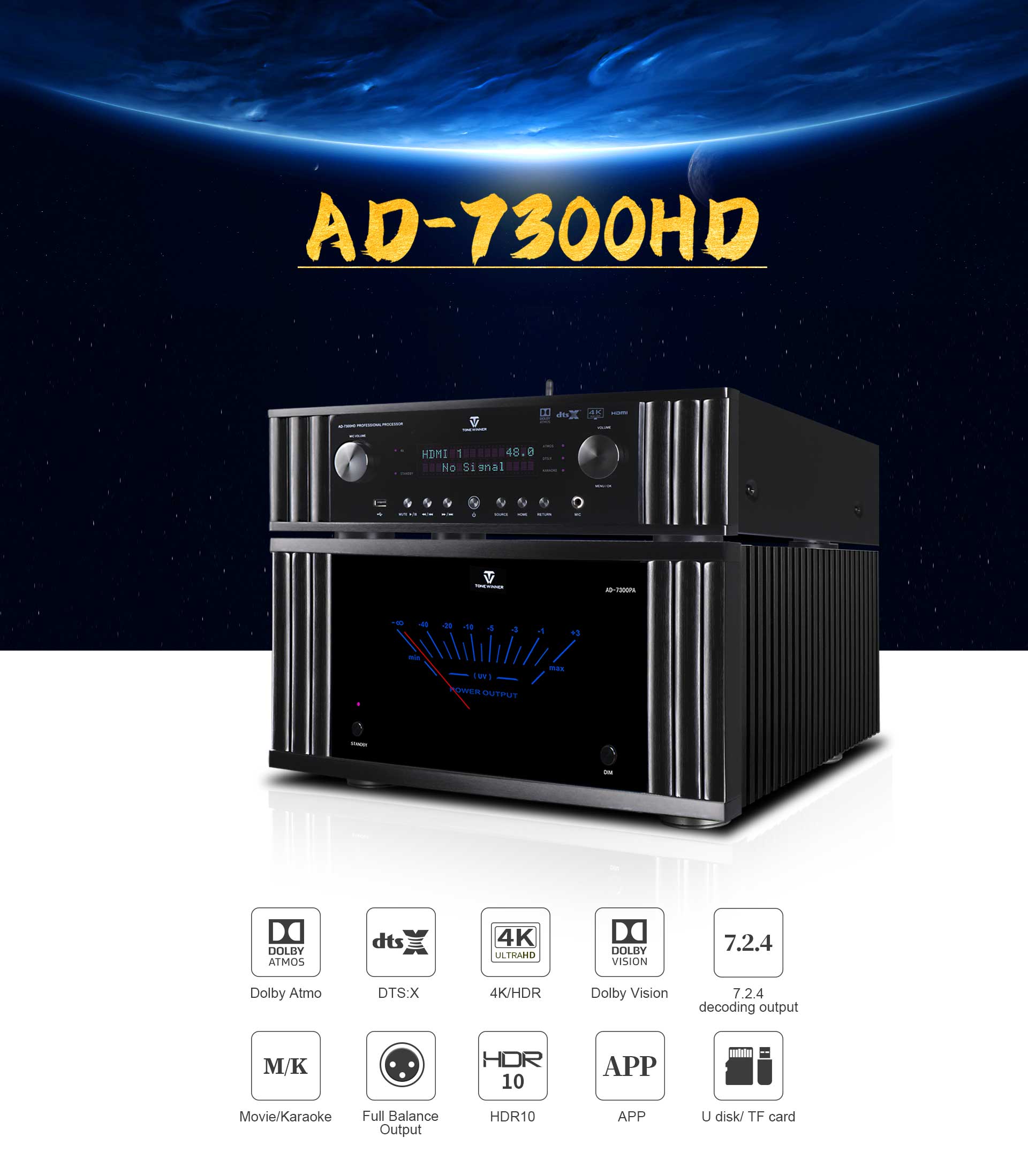 AD-7300HD — это интегрированный аудио-видеопроцессор для музыки, кинотеатра и караоке. Он поддерживает Dolby Atmos, DTS:X, декодирование 4K и совместим с 3D, HDR, Dolby Vision и т.д. Поддерживает экранное меню, подгруппы матрицы, автоматическую калибровку эквалайзера. Также поддерживает управление через приложение, USB-накопитель и TF-карту. Как многофункциональный декодер, он идеально подходит для домашних развлечений с эффектом полного погружения в звук.